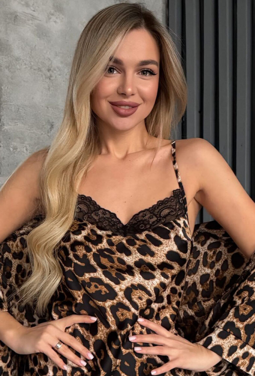Эффектная женская ночнушка от украинского бренда Julia Ulich. Ночнушка выполнена из мягкого и качественного шелк-сатина, бежевого цвета с леопардовым принтом черного и коричневого цвета, полуприлегающего силуэта и длиной выше колен. Модель на тонких регулируемых бретелях, с V-образным декольте и эффектной кружевной спинкой, по линии декольте и внизу украшена вставками из ажурного кружева черного цвета. Ночнушка очень красивая и комфортная, идеальна для приятного сна и непревзойденного домашнего образа, также может быть прекрасным подарком любимому и близкому человеку!