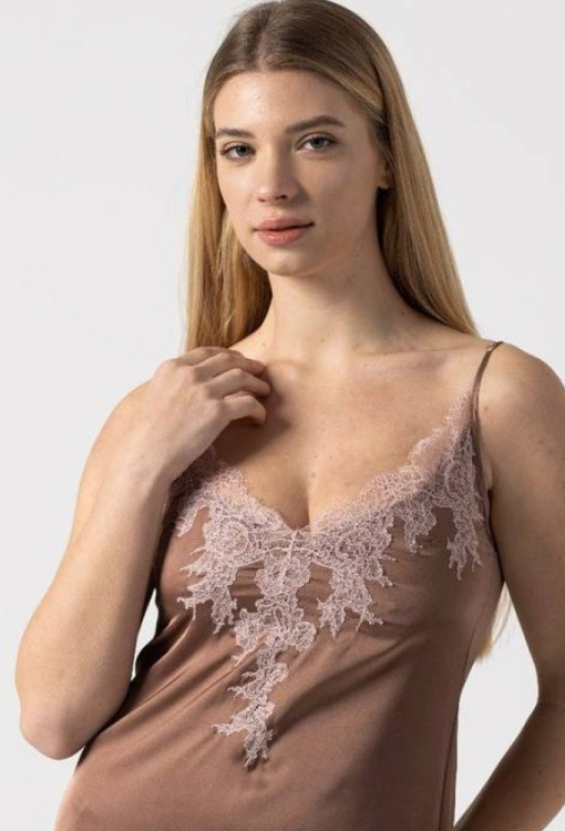 Красивая женская ночнушка из коллекции Mocca от украинского бренда Felena. Ночнушка выполнена из мягкого и качественного вискозного шелка цвета мокко, полуприлегающего силуэта и длиной выше колен. Модель на тонких регулируемых бретелях и с V-образным декольте, внизу слева обработана разрезом, на спинке - глубоким круглым вырезом. По линии декольте и внизу, включая разрез, изделие украшено кружевными вставками в сочетании с аппликациями кремового цвета. Ночнушка роскошная и очень комфортная, придаст сексуальности женскому образу, а также может быть прекрасным подарком любимому и близкому человеку.