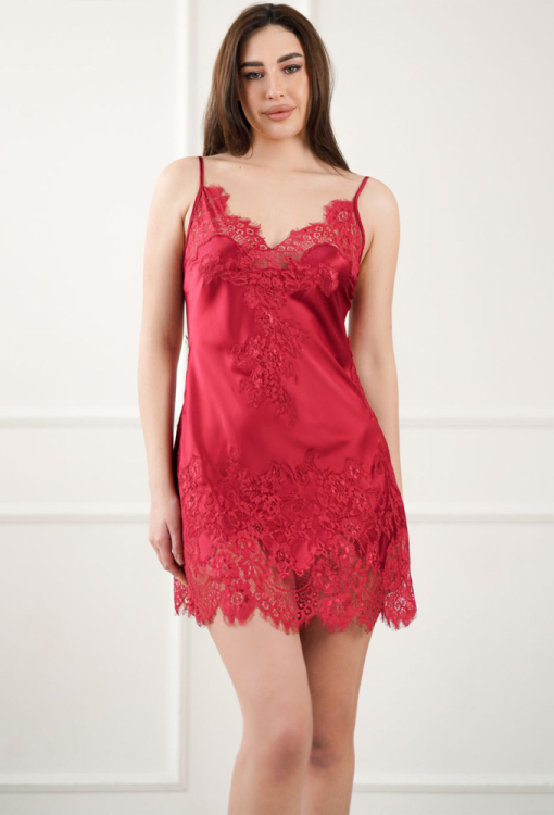 Восхитительная женская ночнушка из коллекции Ruby от украинского бренда Komilfo. Ночнушка выполнена из мягкого и качественного шелк-сатина бордового цвета, полуприлегающего силуэта и с эффектной открытой спинкой. Модель на тонких регулируемых бретелях, с V-образным декольте и длиной мини, украшена широкими вставками из ажурного кружева и кружевными аппликациями, спинка обработана поперечной бретелью. Ночнушка очень красивая и комфортная, подчеркнет сексуальность женского образа, упакованная в фирменную коробку, подойдет для подарка любимой женщине или девушке!