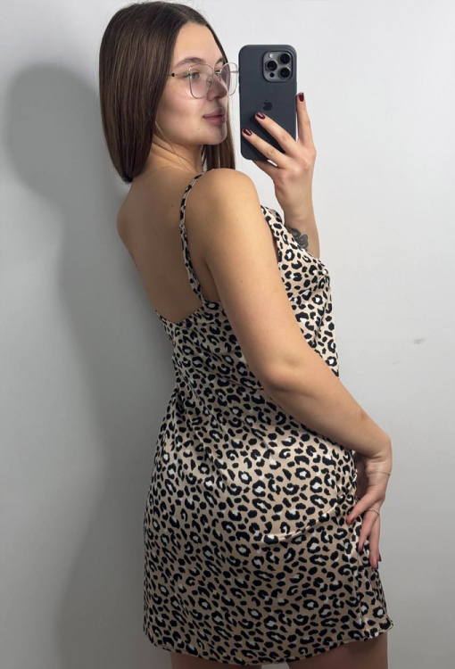 Эффектная женская ночнушка от украинского бренда V.Velika. Ночнушка выполнена из мягкого и качественного шелка Армани, бежевого цвета в мелкий леопардовый принт черного и белого цвета, полуприлегающего силуэта, длиной выше колен. Модель с тонкими регулируемыми бретелями и V-образным декольте, обработана выточками на груди. Ночнушка очень красивая и приятная к телу, подчеркнет сексуальность домашнего образа, также может быть замечательным подарком для любимого и близкого человека.