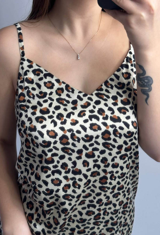 Эффектная женская ночнушка от украинского бренда V.Velika. Ночнушка выполнена из мягкого и качественного шелка Армани, кремового цвета в коричневый и черный леопардовый принт, полуприлегающего силуэта, длиной выше колен. Модель с тонкими регулируемыми бретелями и V-образным декольте, обработана выточками на груди. Ночнушка очень красивая и приятная к телу, подчеркнет сексуальность домашнего образа, также может быть замечательным подарком для любимого и близкого человека.