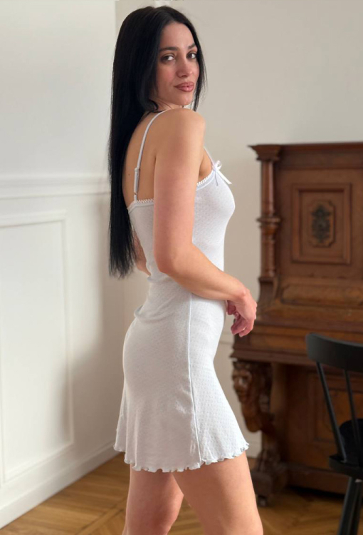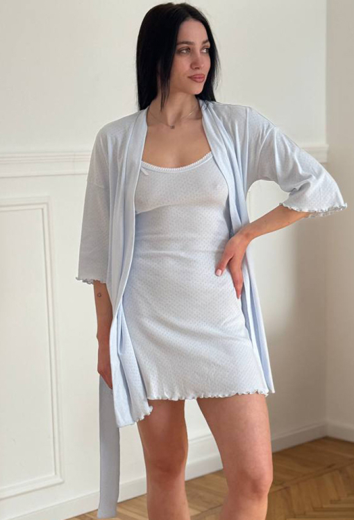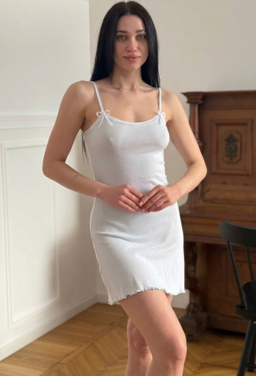 Соблазнительная женская ночнушка от украинского бренда V.Velika. Ночнушка выполнена из мягкого и качественного хлопкового трикотажа с ажурной фактурой в виде маленьких ромбиков голубого цвета, прилегающего силуэта и длиной мини. Модель с тонкими регулируемыми бретелями и круглым декольте, по линии выреза украшена тонким кружевом белого цвета и на бретелях - белыми атласными бантиками. Внизу изделие обработано декоративным волнистым швом. Ночнушка очень легкая и приятная к телу, подчеркнет сексуальность домашнего образа, также может быть замечательным подарком для любимого и близкого человека.