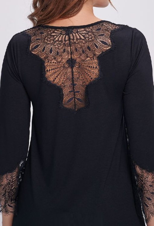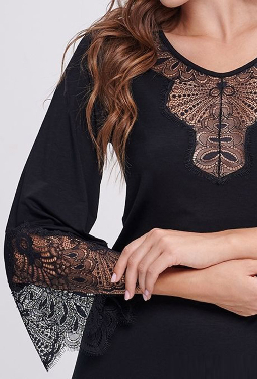 Роскошная женская ночнушка от украинского бренда Shato. Ночнушка выполнена из качественной и мягкой вискозы черного цвета, свободного силуэта и длиной выше колен. Модель с рукавами 3/4 и U-образным вырезом горла, на рукавах и по линии выреза украшена кружевом с тонким эластичным краем. Спинка изделия также оформлена широкой вставкой из вырезного кружева. Ночнушка не только невероятно красивая и удобная, но и станет замечательным подарком для любимого или близкого человека.