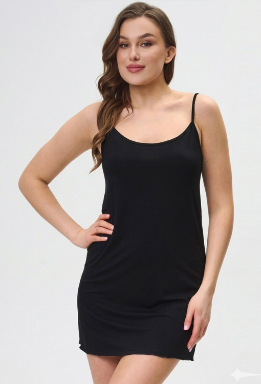 Сексуальная женская ночнушка от украинского бренда Shato. Ночнушка выполнена из качественной и мягкой вискозы черного цвета, полуприлегающего силуэта и длиной мини. Модель с тонкими регулируемыми бретелями и круглым декольте, внизу обработана декоративным швом. Ночнушка очень красивая и приятная к телу, идеальна для создания романтичного домашнего образа, также может быть замечательным подарком для любимого или близкого человека.