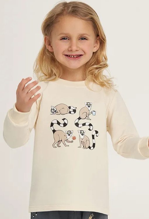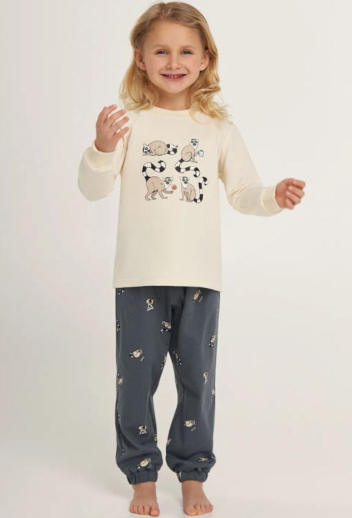 Стильная детская пижама для девочки из коллекции Easy Mood, от украинского бренда Ellen. Пижама выполнена из качественной и мягкой двунитки, состоит из кофты кремового цвета и графитовых штанов в принт из забавных зверей. Кофта с длинными рукавами и круглым вырезом горла, спереди украшена принтом из лемуров. Штаны с мягкой резинкой в поясе и эластичными манжетами внизу. Пижама очень красивая и приятная к телу, также может быть замечательным подарком любимому ребенку.