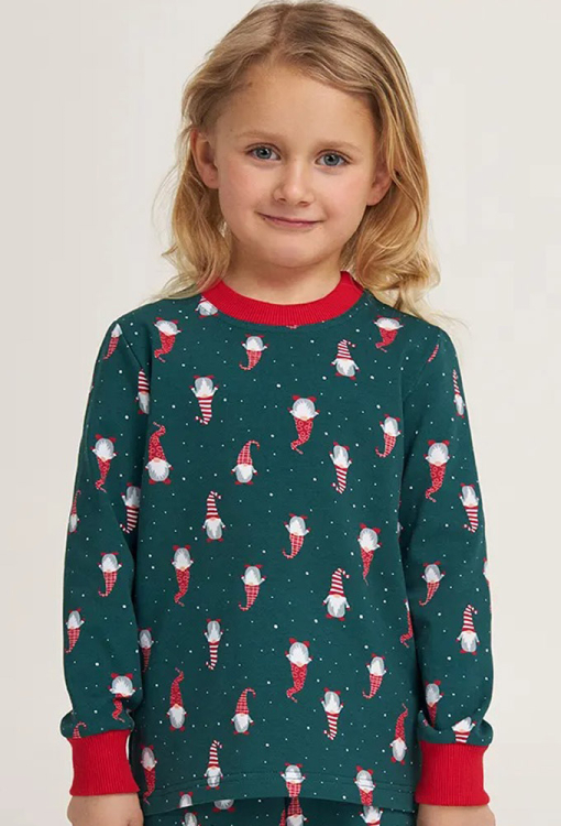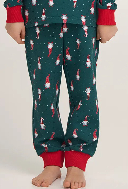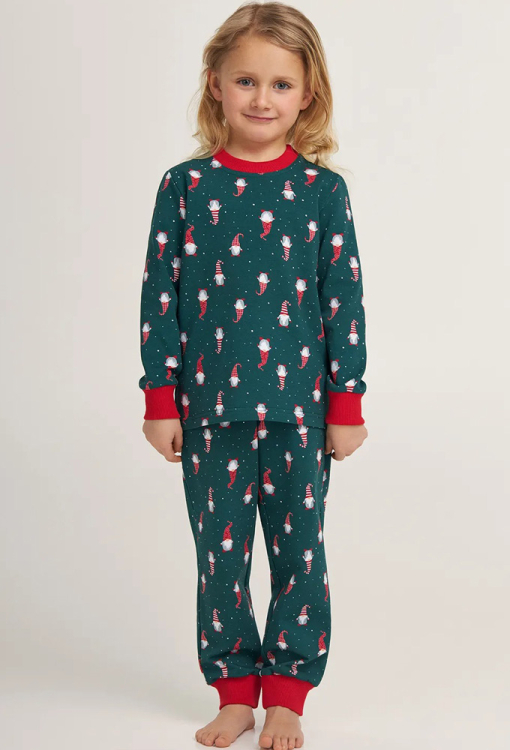 Теплая детская пижама для девочки из коллекции Happy Season, от украинского бренда Ellen. Пижама выполнена из качественной и мягкой байки, зеленого цвета в яркий новогодни принт из гномов и снежинок, состоит из кофты и штанов. Кофта с длинными рукавами и круглым вырезом горла, рукава и вырез обработаны манжетами красного цвета. Штаны с мягкой резинкой в поясе, внизу обработаны удобными манжетами красного цвета. Пижама очень красивая и приятная к телу, также может быть замечательным подарком любимому ребенку.