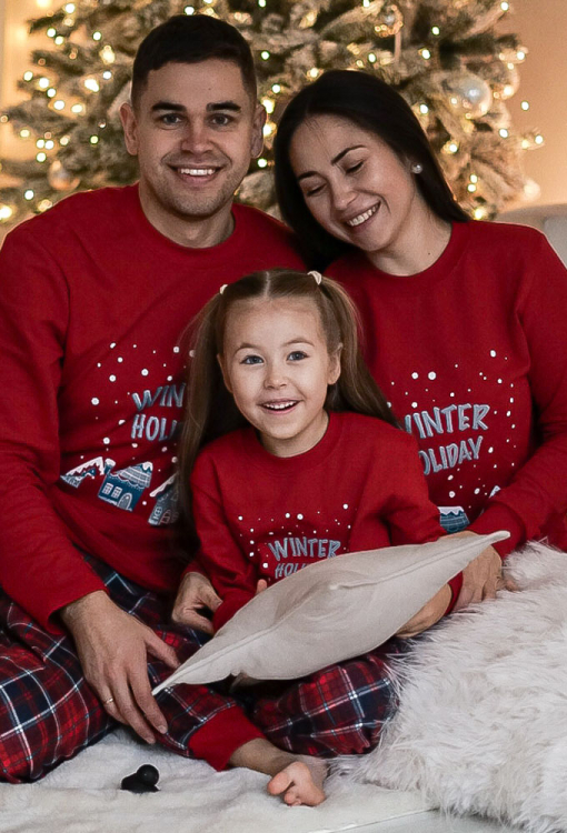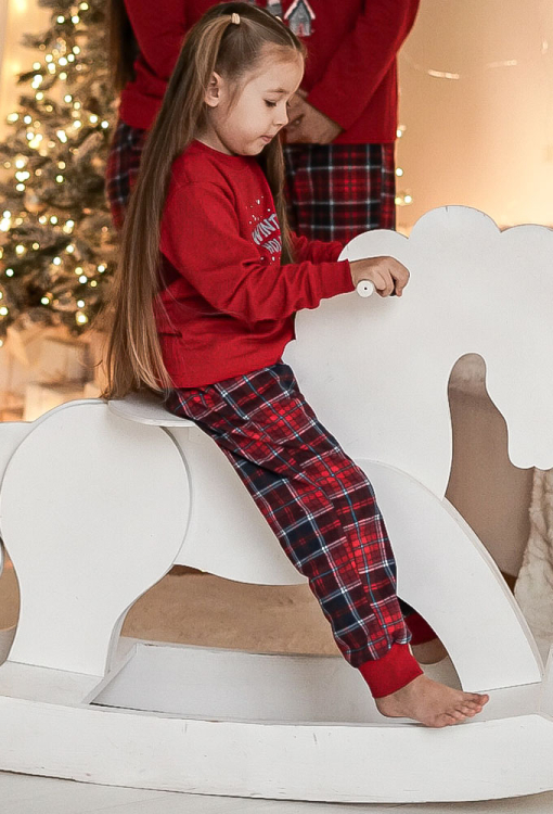 Новогодняя детская пижама для девочки из коллекции Winter Holiday от украинского бренда Cosy. Пижама выполнена из высококачественного и мягкого хлопка с гладкой лицевой стороной и теплой ворсистой изнанкой, состоит из кофты и штанов. Кофта однотонная красного цвета, свободного кроя, с длинными рукавами и круглым вырезом горла, украшена ярким принтом в рождественском стиле и надписью "Winter Holiday". Штаны красного цвета в синий клетчатый принт, с мягкой резинкой в поясе и удобными боковыми карманами, внизу обработаны красными манжетами. Пижама очень красивая и приятная к телу, также может быть замечательным подарком любимому ребенку.