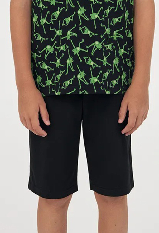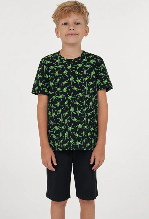 Яркая детская пижама для мальчика из коллекции Happy Frog от украинского бренда Ellen. Пижама выполнена из качественного и мягкого хлопка черного цвета, состоит из футболки прямого силуэта с принтом в виде веселых лягушек и однотонных прямых шорт. Футболка с короткими рукавами и круглым вырезом горла, шорты с мягкой резинкой в поясе и удобными боковыми карманами. Пижама очень красивая и приятная к телу, также может быть замечательным подарком любимому ребенку.