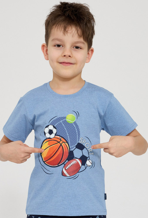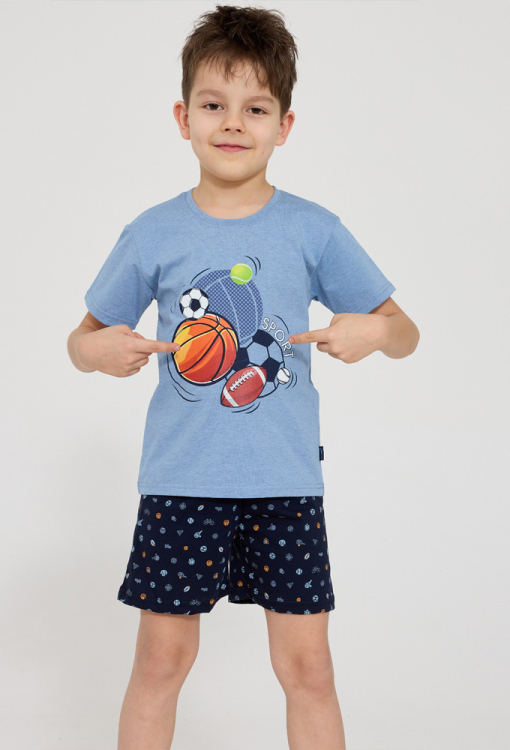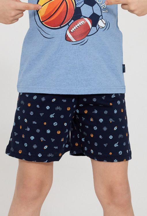 Стильная детская пижама для мальчика Sport от польского бренда Cornette. Пижама выполнена из качественного и мягкого хлопка, состоит из футболки голубого цвета и темно-синих шорт с мелким принтом в виде спортивных атрибутов. Футболка с короткими рукавами и круглым вырезом горла, шорты с мягкой резинкой в поясе. Спереди по центру футболка украшена ярким принтом из мячиков для разных видов спорта - футбол, тенис, баскетбол, волейбол и регби. Пижама очень красивая и комфортная, также будет замечательным подарком для любимого ребенка.