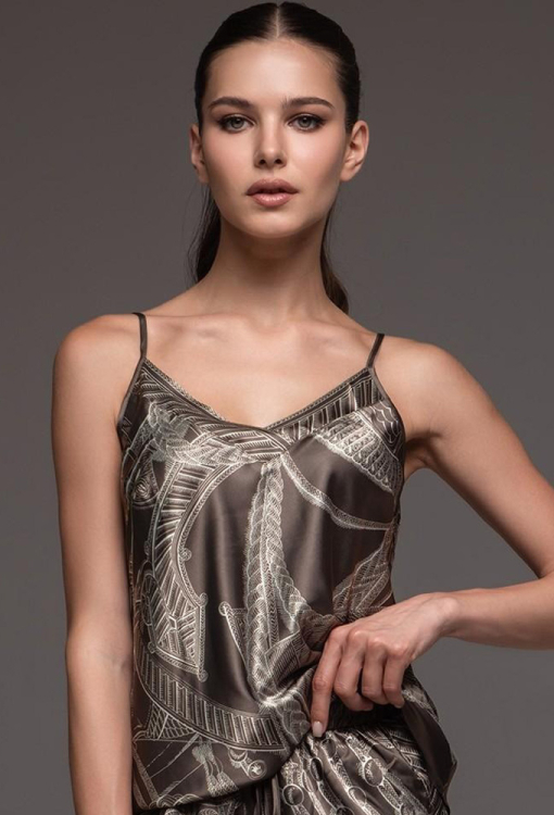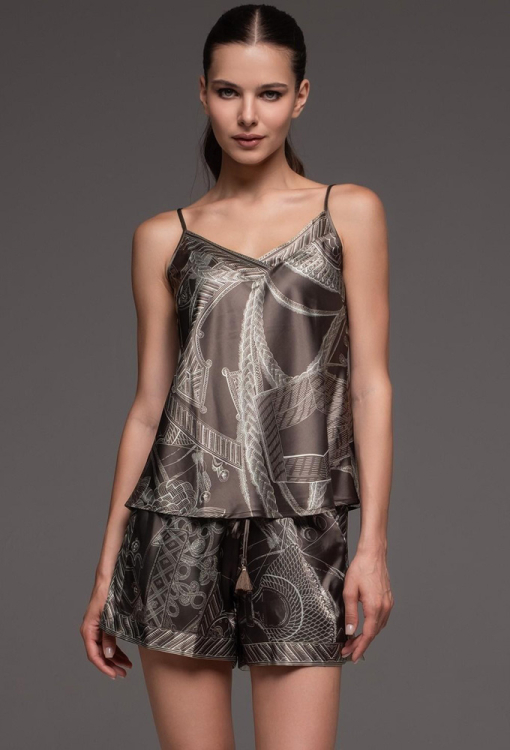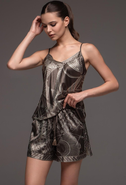 Утонченная женская пижама из коллекции Aisha от итальянского бренда Mia-Amore. Пижама выполнена из смесового полотна на основе натурального шелка, коричневого цвета в серый абстрактный принт, состоит из майки и коротких шорт. Майка полуприлегающего силуэта на тонких регулируемых бретелях и с V-образным декольте, украшенным орнаментом. Шорты с мягкой резинкой в поясе и на завязке с кисточками, по бокам обработаны разрезами и орнаментом, низ также украшен орнаментом. Пижама очень красивая и комфортная, идеально подчеркнет вечерний женский образ, также будет отличным подарком для любимой женщины.