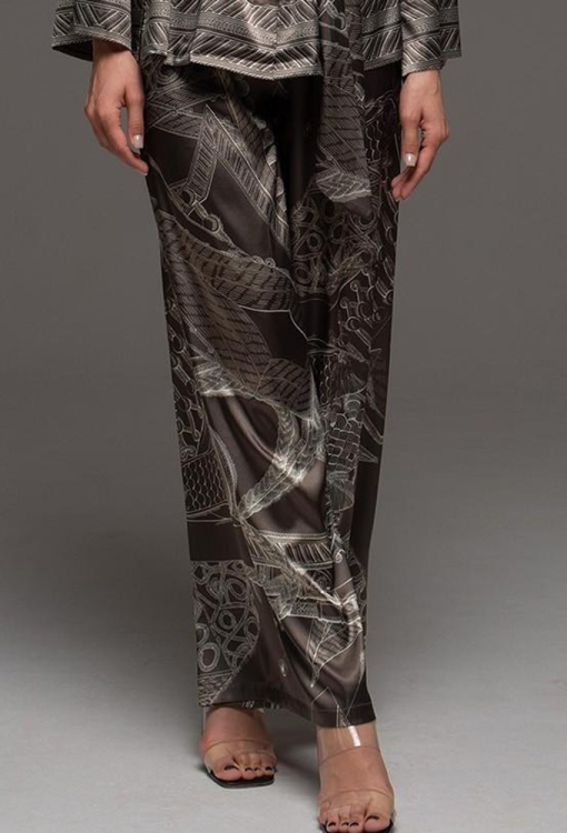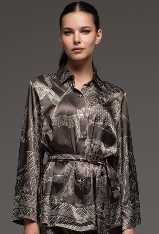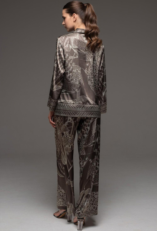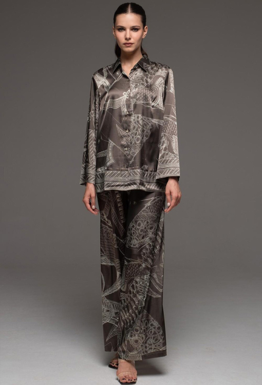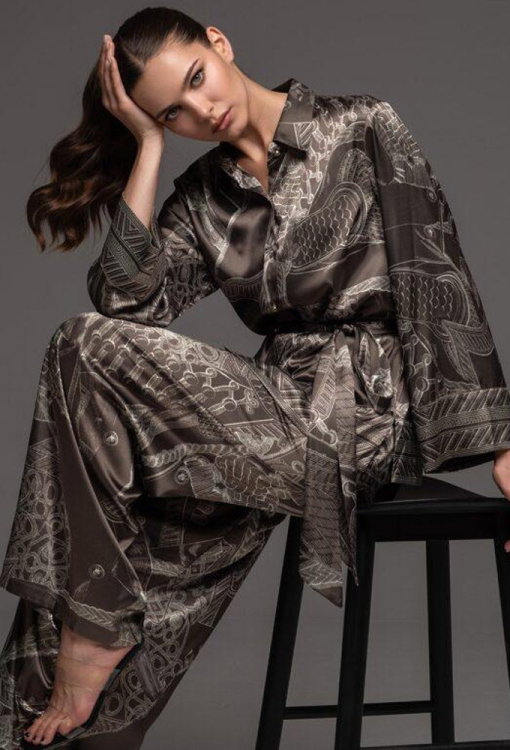 Классическая женская пижама из коллекции Aisha от итальянского бренда Mia-Amore. Пижама выполнена из смесового полотна на основе натурального шелка, коричневого цвета в серый абстрактный принт, состоит из рубашки свободного силуэта и штанов палаццо. Рубашка с длинными рукавами и отложным воротником, застегивается на пуговицы, рукава и низ изделия украшены орнаментом. Штаны с мягкой резинкой в поясе. Модель дополнена широким поясом, с помощью которого можно подчеркнуть талию. Пижама очень красивая и комфортная, идеально подчеркнет вечерний женский образ, также будет отличным подарком для любимой женщины.