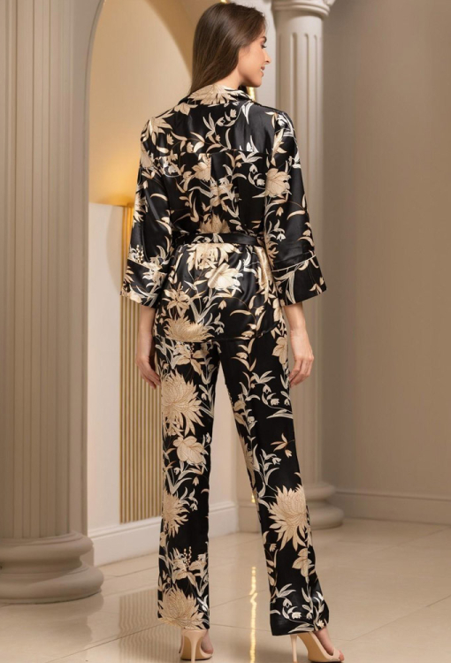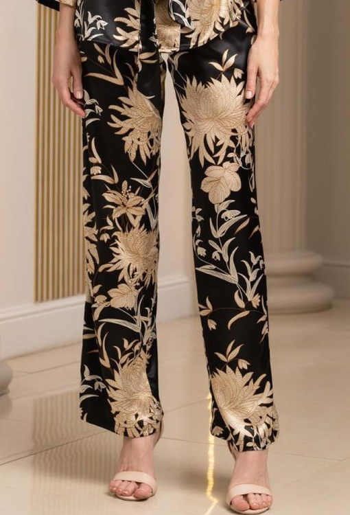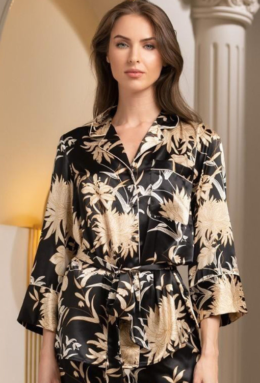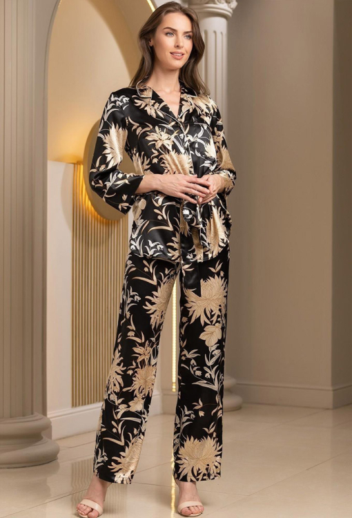 Классическая женская пижама из коллекции Elmira от итальянского бренда Mia-Amore. Пижама выполнена из смесового полотна на основе натурального шелка, черного цвета с бежевым принтом в виде крупных цветов, состоит из рубашки и штанов. Рубашка прямого силуэта, с рукавами 3/4 на манжетах с разрезами и отложным воротником, застегивается на пуговицы и завязывается поясом. На груди слева модель украшена маленьким накладным карманчиком, воротник полки, рукава и карман обработаны кантом золотистого цвета. Штаны прямого кроя, с мягкой резинкой в поясе и удобными боковыми карманами. Пижама стильная и очень комфортная, придаст уверенности домашнему образу, также будет отличным подарком для любимой женщины.