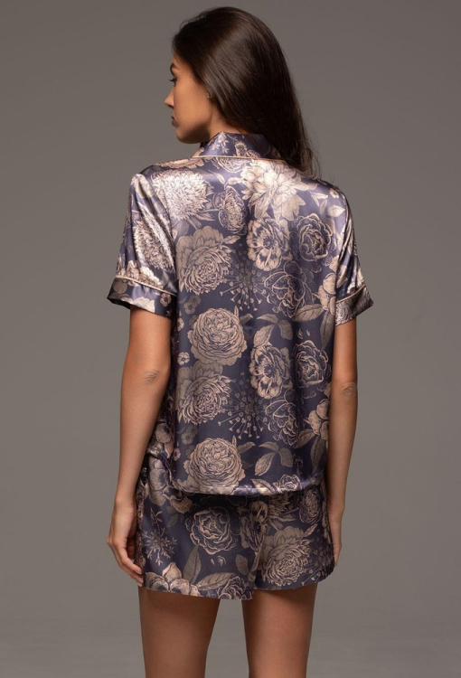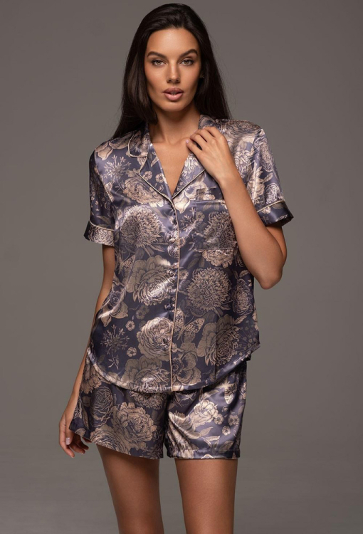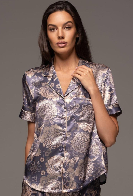Элегантная женская пижама из коллекции Giaconda от итальянского бренда Mia-Amore сочетает комфорт и изысканный стиль. Пижама выполнена из смесового полотна на основе натурального шелка, серо-синего цвета с изысканным цветочным принтом бежевого цвета. Комплект состоит из рубашки свободного силуэта и коротких шорт прямого кроя. Рубашка с короткими рукавами и отложным воротником, застегивается на пуговицы. На груди слева модель украшена маленьким накладным карманчиком, воротник, борта, рукава и карман обработаны тонким кантом бежевого цвета, что придает выразительности образу. Шорты с мягкой резинкой в поясе и боковыми карманами, создают удобную посадку и не сковывают движений. Пижама очень красивая и удобная на каждый день, идеально подходит для сна и домашнего отдыха, а также может стать отличным подарком для близкого человека.