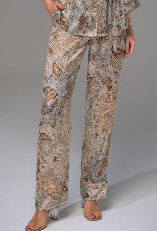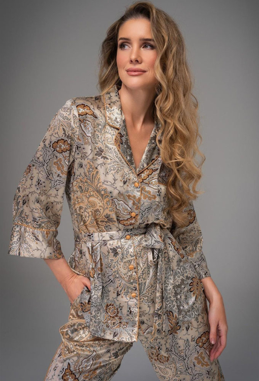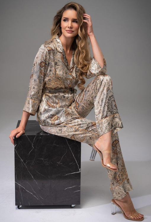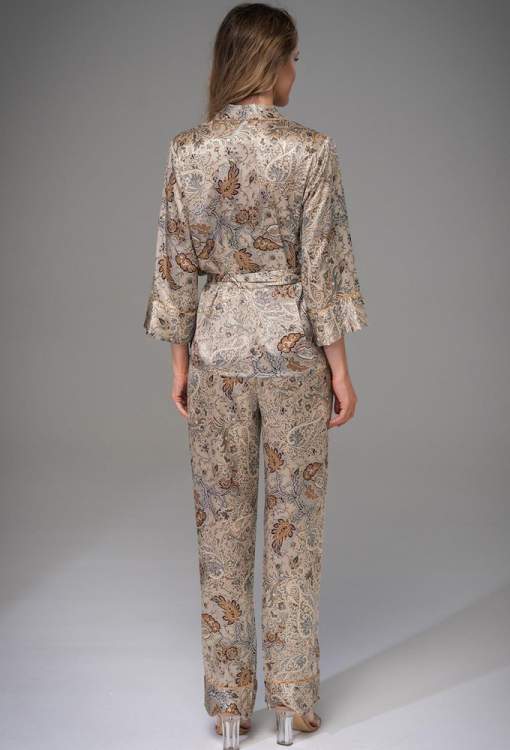 Шикарная женская пижама из коллекции Livia от итальянского бренда Mia-Amore. Пижама выполнена из смесового полотна на основе натурального шелка, бежевого цвета с восточным принтом коричневого и серого цвета, состоит из рубашки со штанами прямого силуэта. Рубашка с рукавами 7/8 и отложным воротником, застегивается на пуговицы и завязывается поясом. Рукава модели обработаны притачными манжетами и украшены тонким кантом бежевого цвета, воротник и полки также украшены кантом. Штаны с мягкой резинкой в поясе и удобными боковыми карманами, внизу обработаны свободными манжетами и контрастной отделкой. Пижама очень красивая и комфортная, идеальна для сна и домашнего отдыха, а также подарка близким людям.