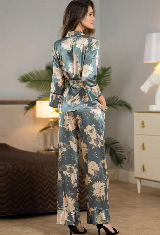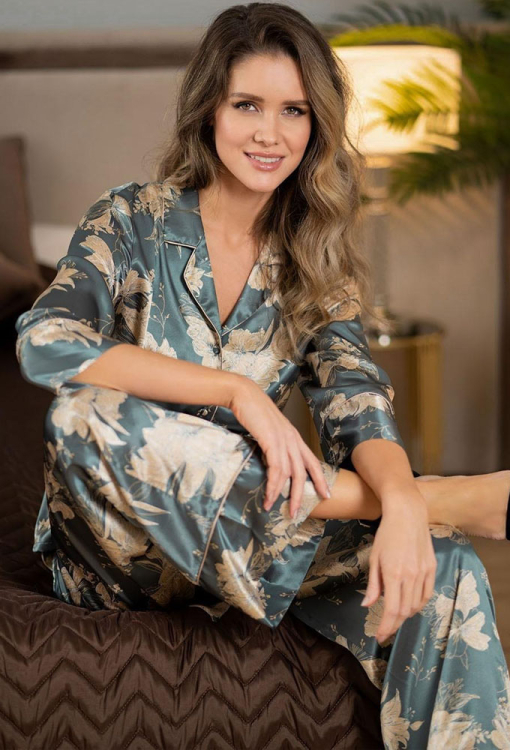Элегантная женская пижама из коллекции Ornelia от итальянского бренда Mia-Amore. Пижама выполнена из смесового полотна на основе натурального шелка, дымчато зеленого цвета с кремовым цветочным принтом, состоит из рубашки со штанами прямого силуэта. Рубашка с рукавами 7/8 и отложным воротником, застегивается на пуговицы и завязывается поясом. Воротник, борта и рукава модели украшены тонким кантом кремового цвета. Штаны с мягкой резинкой в поясе и удобными боковыми карманами, внизу украшены тонким контрастным кантом. Пижама стильная и очень комфортная, идеально подчеркнет домашний образ, а также может быть отличным подарком для любимой женщины.
