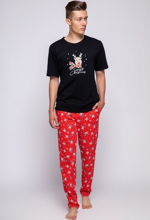 Стильная новогодняя мужская пижама Rudolfo от польского бренда Sensis. Пижама выполнена из качественного и натурального хлопка, состоит из футболки черного цвета и свободных красных штанов в принт оленей. Футболка с круглым вырезом горла и короткими рукавами, штаны с мягкой резинке в поясе и удобными боковыми карманами. На груди футболка украшена стильным новогодним принтом оленя в шарфике. Пижама очень комфортная и удобная, будет отличным вариантом домашней одежды и замечательным подарком для близких людей на Рождество.