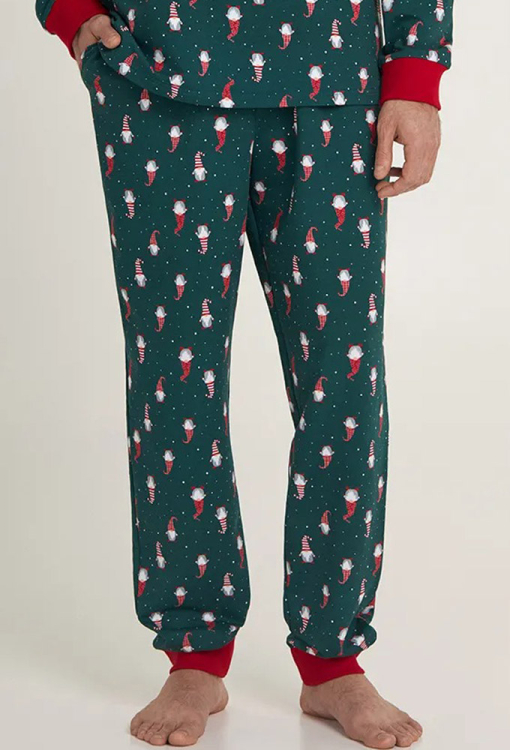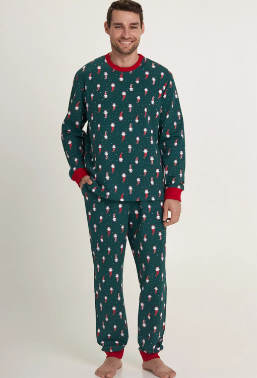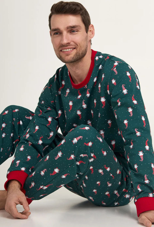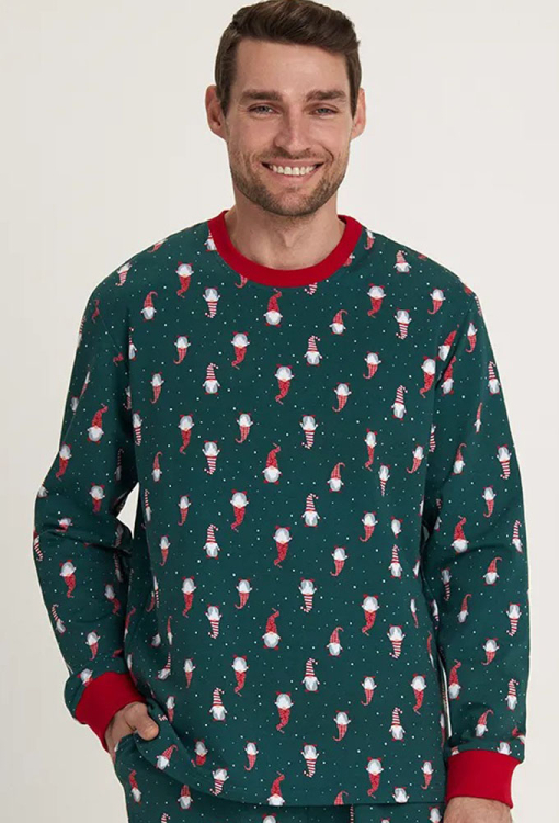 Теплая пижама мужская из коллекции Happy Season от украинского бренда Ellen. Пижама выполнена из качественного и мягкого хлопка с начесом, зеленого цвета в новогодний принт в виде гномов в красных колпаках, состоит из кофты и штанов. Кофта свободного силуэта, с длинными рукавами и круглым вырезом горла, горловина и рукава обработаны манжетами красного цвета. Штаны свободного кроя, с мягкой резинкой в поясе и красными манжетами внизу. Пижама очень красивая и комфортная, идеальна для сна и домашнего отдыха, а также может быть замечательным подарком любимому и близкому человеку.