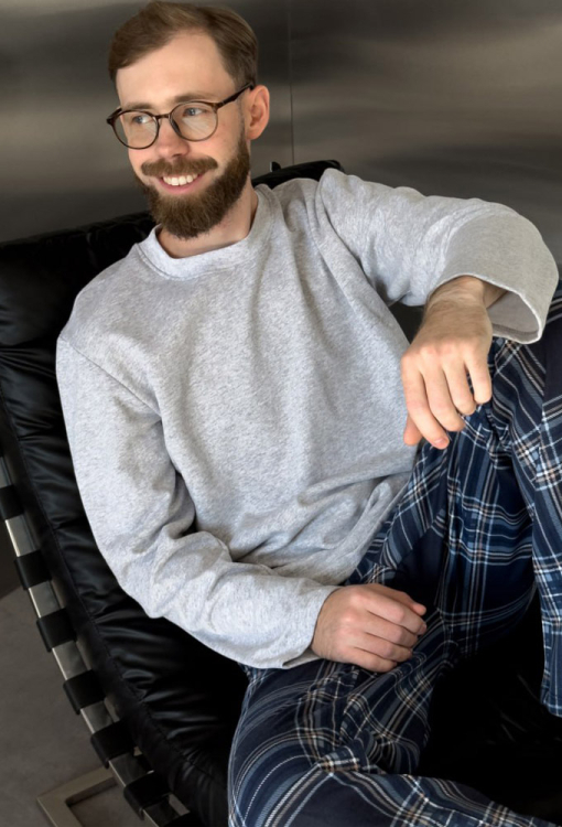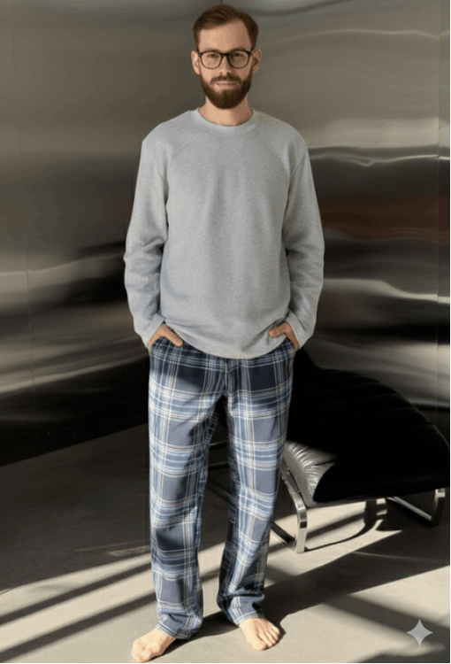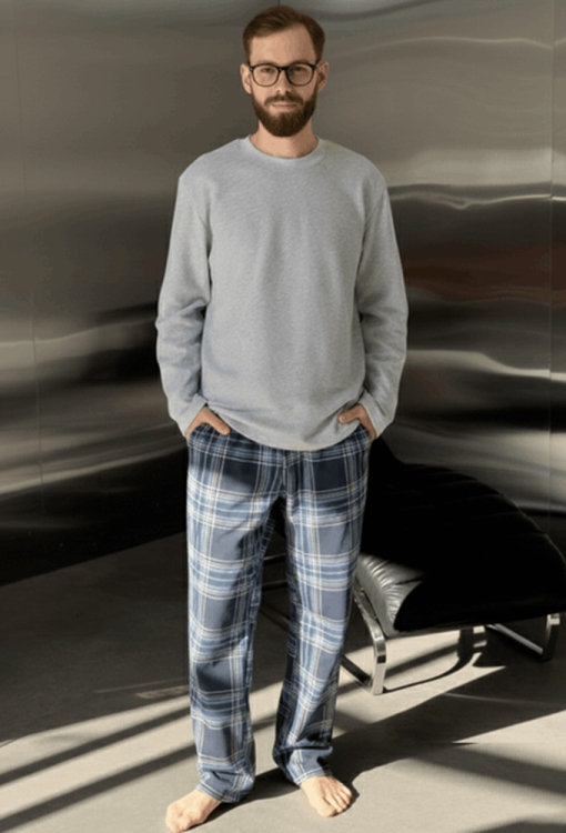 Теплая пижама мужская Скандинавия New от украинского бренда Cosy. Пижама выполнена из высококачественного и мягкого футера с начесом на внутренней стороне, состоит из кофты и штанов. Кофта однотонная серого цвета, свободного кроя, с длинными рукавами и круглым вырезом горла. Штаны темно-синего цвета в синий клетчатый принт, прямого кроя с мягкой резинкой в поясе и удобными боковыми карманами. Пижама очень красивая и комфортная, можно использовать в качестве одежды для дома или подарка любимому и близкому человеку.