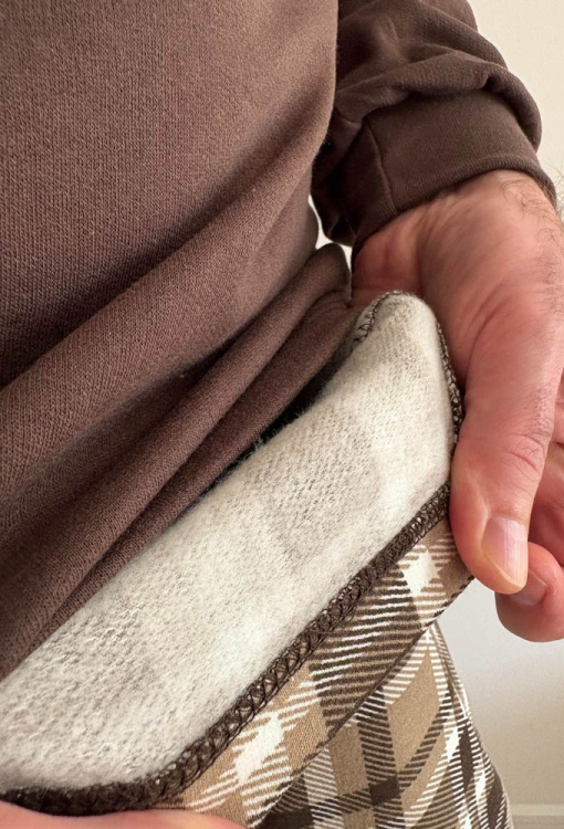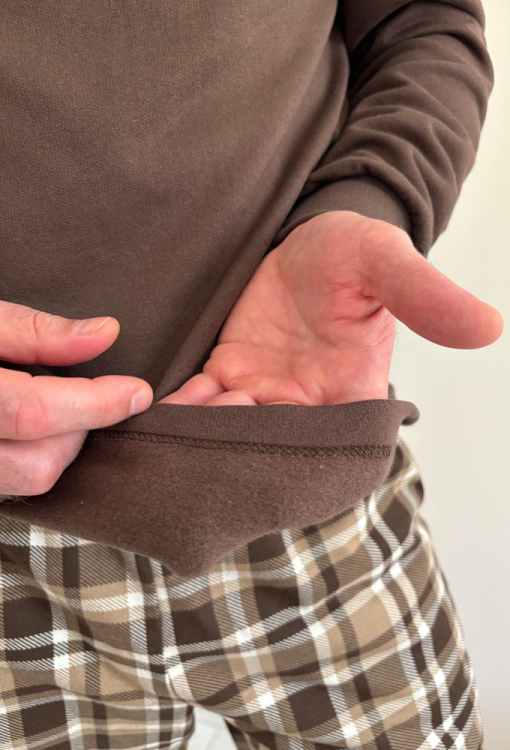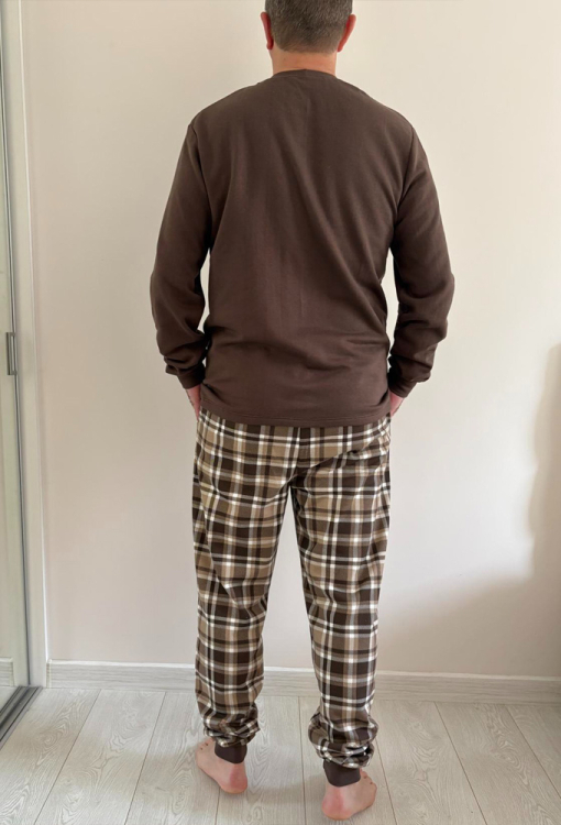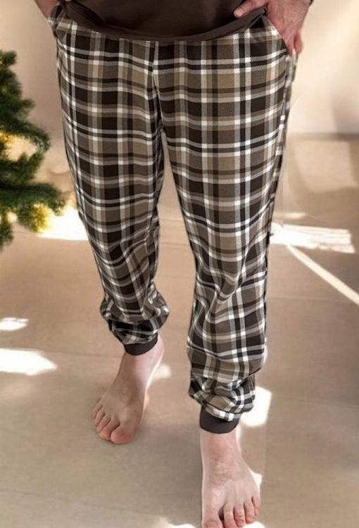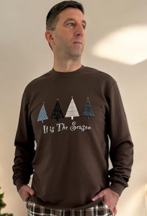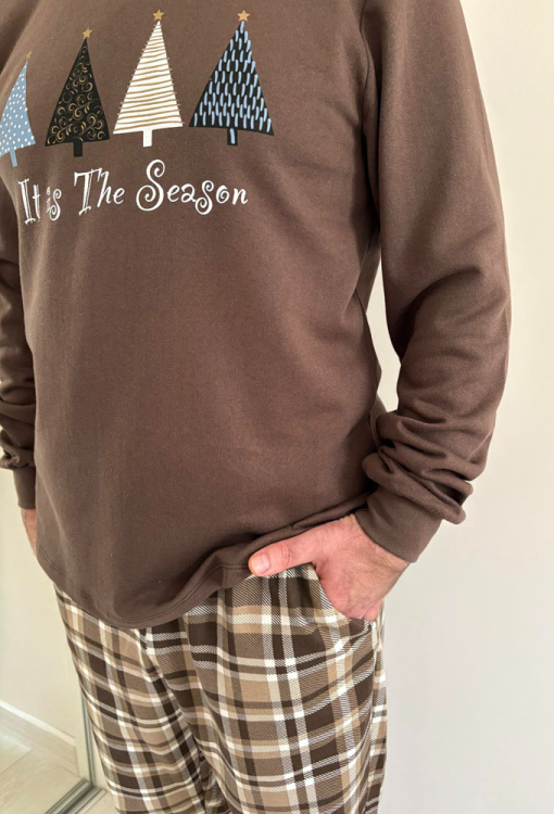 Новогодняя и теплая пижама мужская Святковий Затишок от украинского бренда Cosy. Пижама выполнена из высококачественного и мягкого футера с начесом на внутренней стороне, состоит из кофты и штанов. Кофта коричневого цвета, свободного кроя, с длинными рукавами и круглым вырезом горла. Спереди модель украшена принтом в виде милых елок и праздничной надписи "It is The Season". Штаны бежевого цвета в коричневый клетчатый принт, с мягкой резинкой в поясе и удобными боковыми карманами, внизу обработаны манжетами коричневого цвета. Пижама очень красивая и комфортная, можно использовать в качестве одежды для дома или подарка любимому и близкому человеку.
