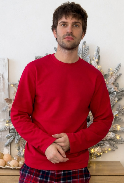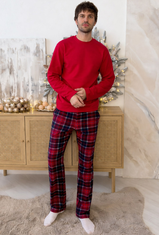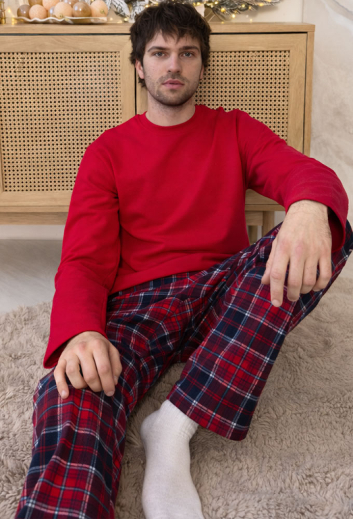 Теплая мужская пижама Winter Holiday от украинского бренда Cosy. Пижама выполнена из высококачественного и мягкого хлопка с гладкой лицевой стороной и теплой ворсистой изнанкой, состоит из кофты и штанов. Кофта однотонная красного цвета, свободного кроя, с длинными рукавами и круглым вырезом горла. Штаны красного цвета в синий клетчатый принт, прямого кроя с мягкой резинкой в поясе и удобными боковыми карманами. Пижама очень красивая и комфортная, создаст праздничное настроение и согреет в самые холодные дни, также подойдет в качестве подарка любимому и близкому человеку.