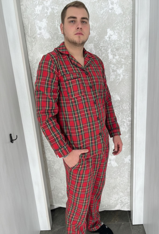 Теплая мужская пижама от украинского бренда BO.Brand. Пижама выполнена из мягкой и качественной фланели, красного цвета в зеленый клетчатый принт с белым акцентом, состоит из рубашки и штанов прямого силуэта. Рубашка с длинными рукавами, отложным воротником и накладным карманом на груди, застегивается на пуговицы. Воротник, полки, рукава и карман модели украшены тонким кантом черного цвета. Штаны с мягкой резинкой в поясе и удобными боковыми карманами, создают комфортную посадку и не стесняют движений. Пижама очень красивая и приятная к телу, идеальна для сна и отдыха в холодную пору, а также может быть отличным подарком любимому или близкому человеку.