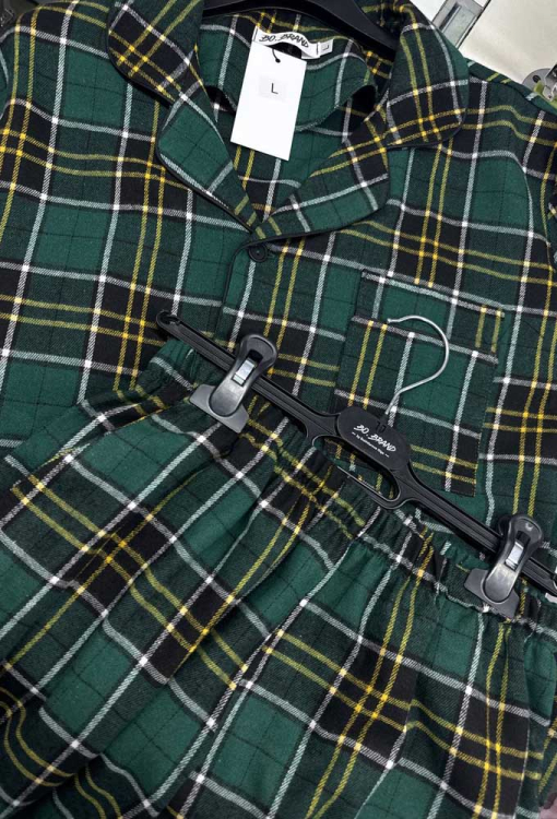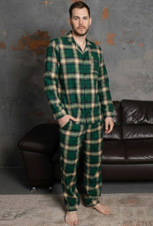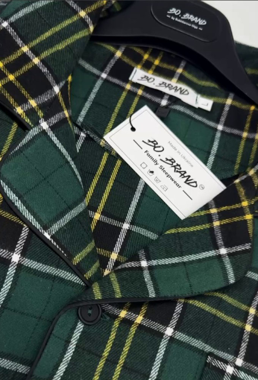 Уютная мужская пижама от украинского бренда BO.Brand - стильный и практичный комплект на холодное время года. Пижама выполнена из мягкой и качественной фланели с начёсом, зеленого цвета в черный клетчатый принт с желтым и белым акцентом, состоит из рубашки и штанов прямого силуэта. Рубашка с длинными рукавами, отложным воротником и накладным карманом на груди застёгивается на пуговицы, воротник, планки, рукава и карман украшены тонким чёрным кантом, что придаёт модели аккуратный и выразительный вид. Штаны с мягкой резинкой на талии обеспечивают удобную посадку и свободу движений. Пижама не только красивая и приятная к телу - она станет отличным вариантом для сна и отдыха, а также полезным подарком любимому или близкому человеку.