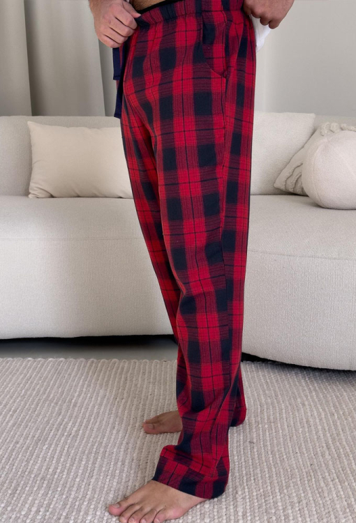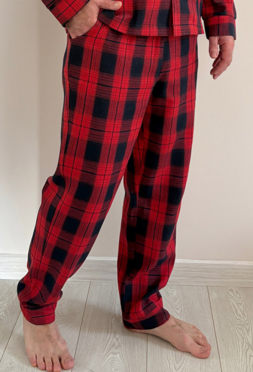 Уютная пижама мужская Glen от украинского бренда Cosy. Модель изготовлена из качественной, мягкой фланели красного цвета с синим клетчатым принтом и состоит из классической рубашки и брюк. Рубашка имеет длинные рукава и отложной воротник, на рукавах — свободные манжеты, а слева вверху расположен аккуратный накладной карман. Брюки оснащены мягкой резинкой на поясе и удобными боковыми карманами, регулируются по ширине благодаря внутреннему шнурку, а низ выполнен на свободных манжетах. Пижама выглядит стильно и обеспечивает максимальный комфорт – это отличный выбор не только для сна, но и для домашнего отдыха или как приятный подарок близкому человеку.