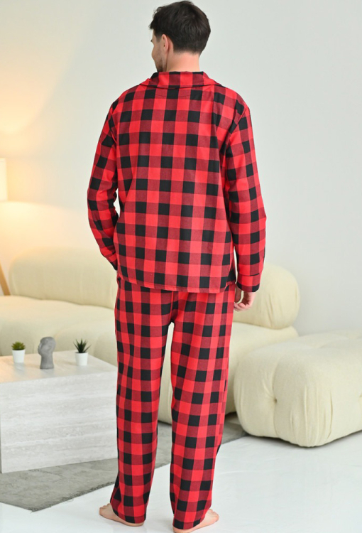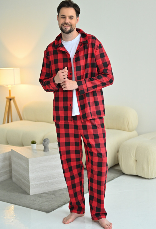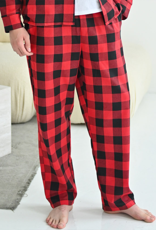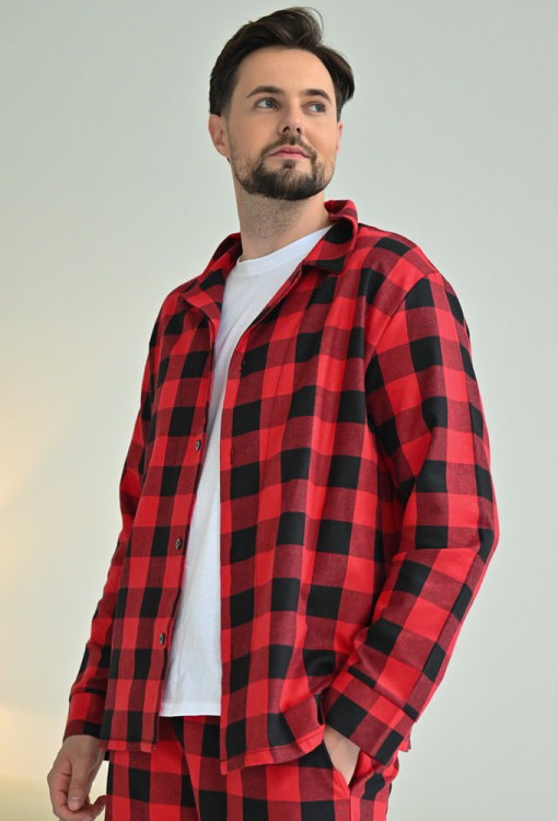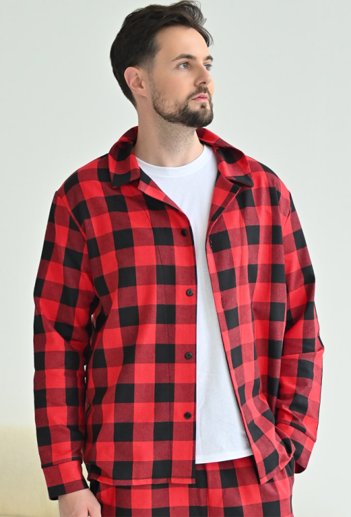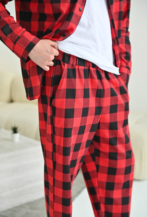 Яркая и удобная мужская пижама от украинского бренда LoomLine. Пижама выполнена из качественной и мягкой фланели, красного цвета в черный клетчатый принт, состоит из рубашки со штанами прямого силуэта. Рубашка с длинными рукавами и отложным воротником, застегивается на пуговицы, рукава обработаны свободными манжетами. Штаны с мягкой резинкой в поясе и удобными боковыми карманами. Пижама красивая и очень комфортная, идеальна для сна и домашнего уюта, а также может быть замечательным подарком любимому и близкому человеку.