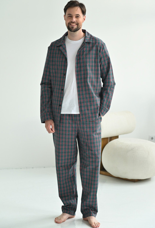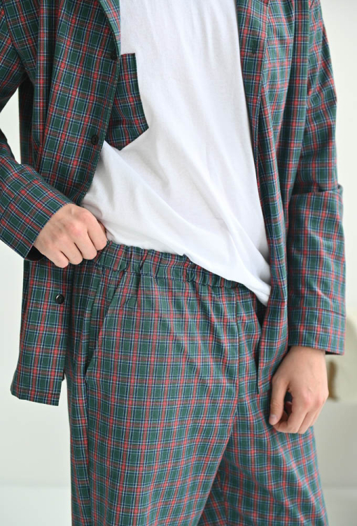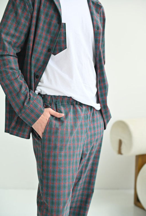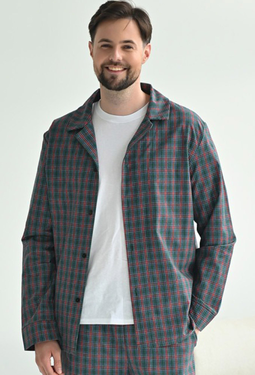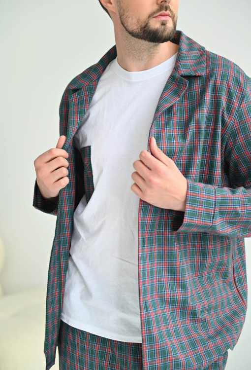 Комфортная мужская пижама от украинского бренда LoomLine. Пижама выполнена из качественной и мягкой фланели, зеленого цвета с красным клетчатым принтом, состоит из рубашки со штанами прямого силуэта. Рубашка с длинными рукавами и отложным воротником, застегивается на пуговицы, рукава обработаны свободными манжетами. Штаны с мягкой резинкой в поясе и удобными боковыми карманами. Пижама красивая и очень удобная, идеальна для сна и домашнего уюта, а также может быть замечательным подарком любимому и близкому человеку.
