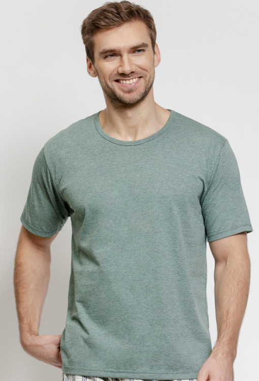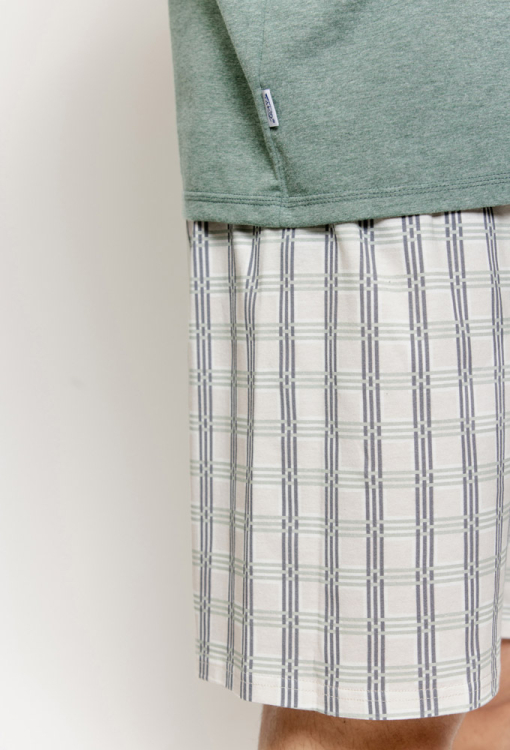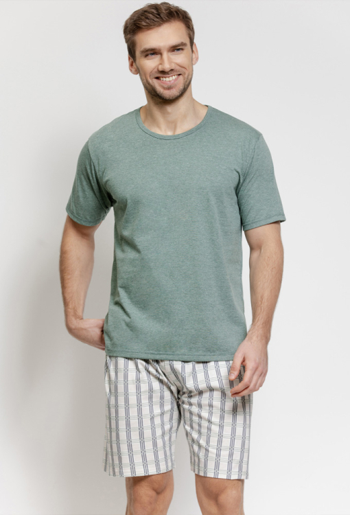Летняя мужская пижама Alex от польского бренда Taro. Пижама выполнена из качественного и мягкого хлопка, состоит из футболки зеленого меланжевого цвета и шорт молочного цвета с серым и графитовым клетчатым принтом. Футболка прямого силуэта, с короткими рукавами и круглым вырезом горла, шорты прямого кроя с мягкой резинкой в поясе. Пижама очень красивая и приятная к телу, также будет удобной домашней одеждой или замечательным подарком для близких людей.