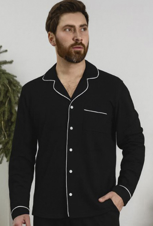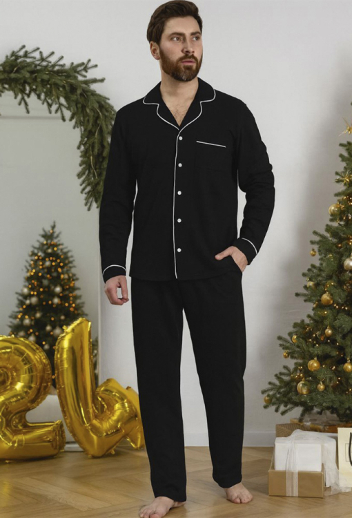 Классическая пижама мужская из коллекции Assorty от украинского бренда Libertine. Пижама выполнена из качественного и мягкого хлопка черного цвета, состоит из рубашки и штанов. Рубашка прямого силуэта, с длинными рукавами и отложным воротником, на груди слева украшена маленьким накладным карманом. Воротник полки, рукава и карман модели обработаны тонким кантом белого цвета. Штаны также прямого кроя, с мягкой резинкой в поясе и удобными боковыми карманами. Пижама стильная и очень комфортная, идеальна для сна и домашнего отдыха, а также может быть замечательным подарком любимому и близкому человеку.
