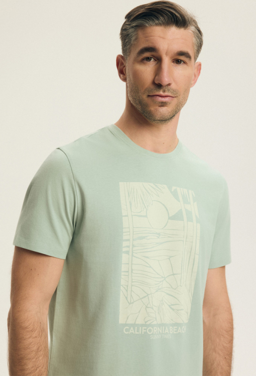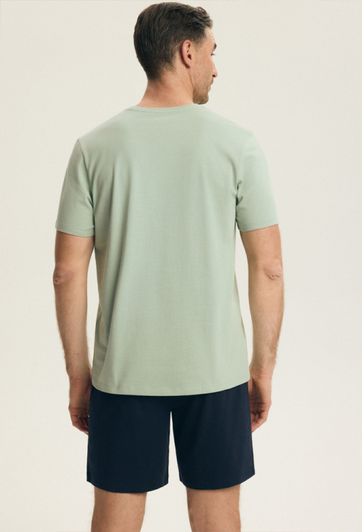 Комфортная пижама мужская Brook от польского бренда Henderson. Пижама выполнена из качественного и мягкого хлопка, состоит из футболки светло-зеленого цвета и темно-синих шорт. Футболка с короткими рукавами и круглым вырезом горла, спереди украшена принтом из морского побережья и надписью "California beach". Шорты прямого кроя и с мягкой резинкой в поясе, создают максимальный комфорт и свободу движений. Пижама красивая и невероятно удобная, идеальна для уютного сна и расслабленных домашних вечеров, упакована в фирменную коробку, станет приятным подарком для любимого и близкого человека.