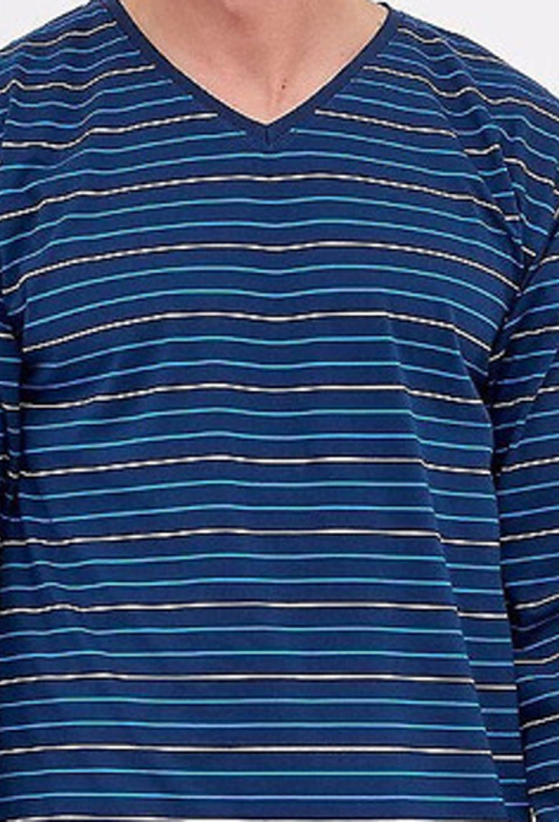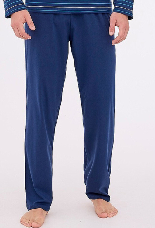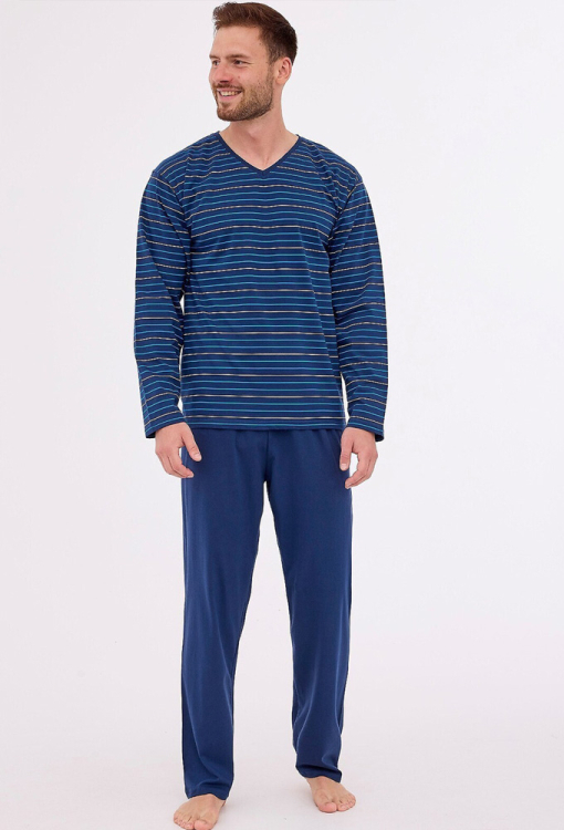 Элегантная пижама мужская от польского бренда Cornette. Пижама выполнена из качественного и мягкого хлопка джинсового цвета, состоит из кофты в белую и голубую полоску и однотонных штанов. Кофта с длинными рукавами и V-образным вырезом горла, штаны прямого кроя и с мягкой резинкой в поясе. Пижама стильная и очень комфортная, упакованная в фирменную коробку, может быть замечательным подарком близким людям.