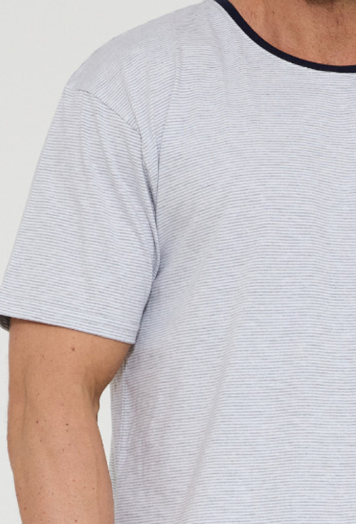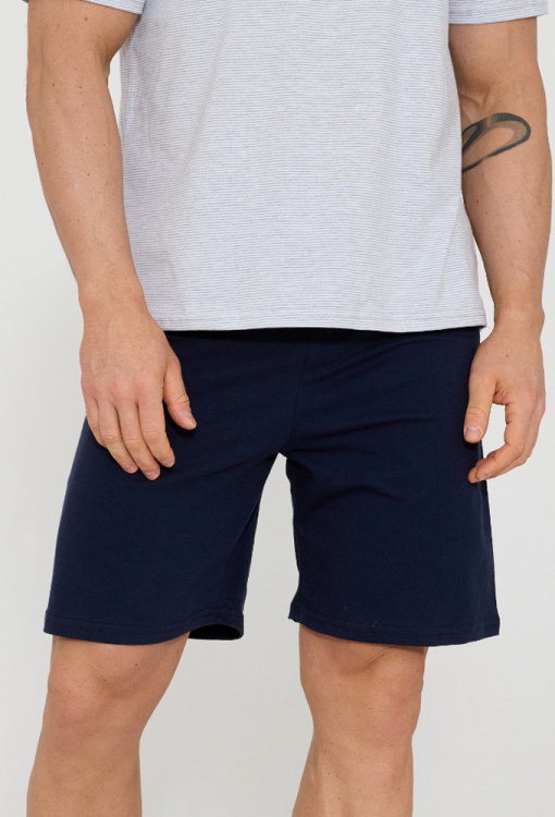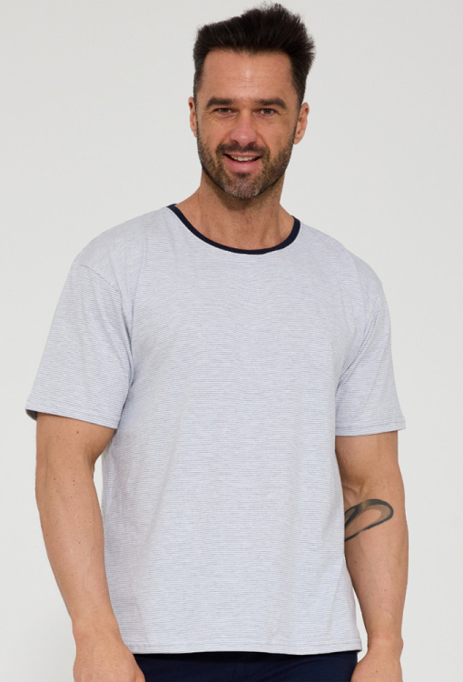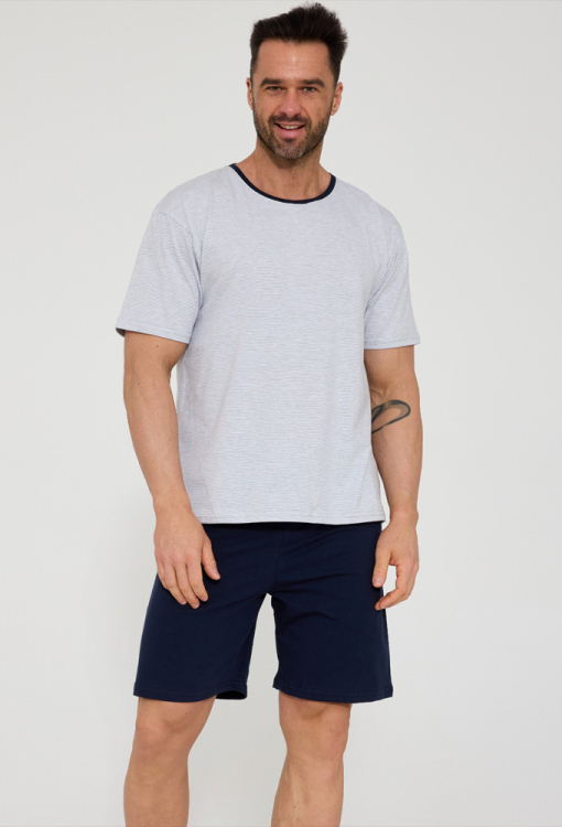 Классическая мужская пижама от польского бренда Cornette. Пижама выполнена из качественного и мягкого хлопка, состоит из футболки светло-серого цвета с едва заметной полоской и темно-синих шорт. Футболка с короткими рукавами и круглым вырезом горла, шорты с мягкой резинкой в поясе. Линия выреза футболки украшена кантом темно-синего цвета. Пижама очень красивая и комфортная, идеальна для сна и домашнего отдыха летом, упакованная в коробку, станет замечательным подарком близким людям.
