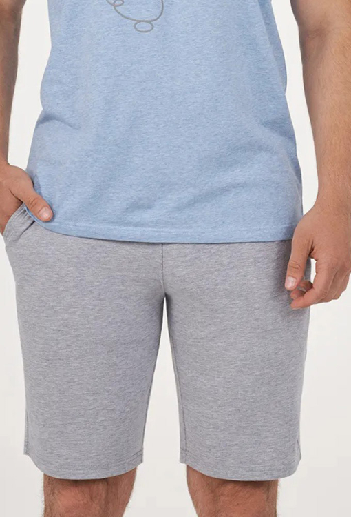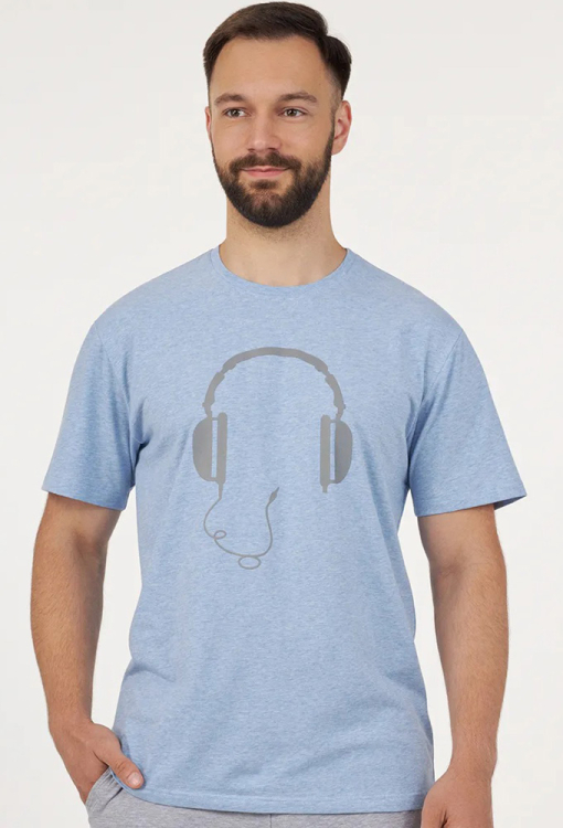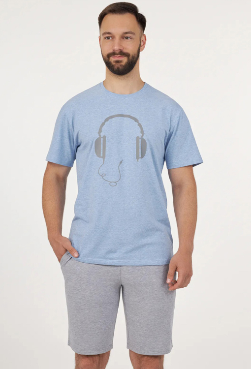 Стильная мужская пижама из коллекции Daniel от украинского бренда Ellen. Пижама выполнена из качественного и мягкого хлопка, состоит из футболки голубого цвета и серых шорт. Футболка прямого силуэта, с короткими рукавами и круглым вырезом горла, спереди украшена принтом в виде наушников. Шорты с мягкой резинкой в поясе и удобными боковыми карманами. Пижама очень красивая и комфортная, идеальна для сна и домашнего отдыха, а также может быть замечательным подарком любимому и близкому человеку.