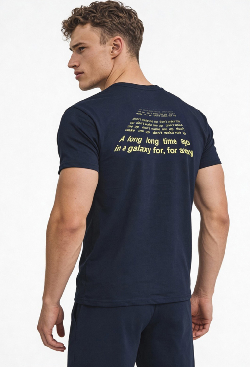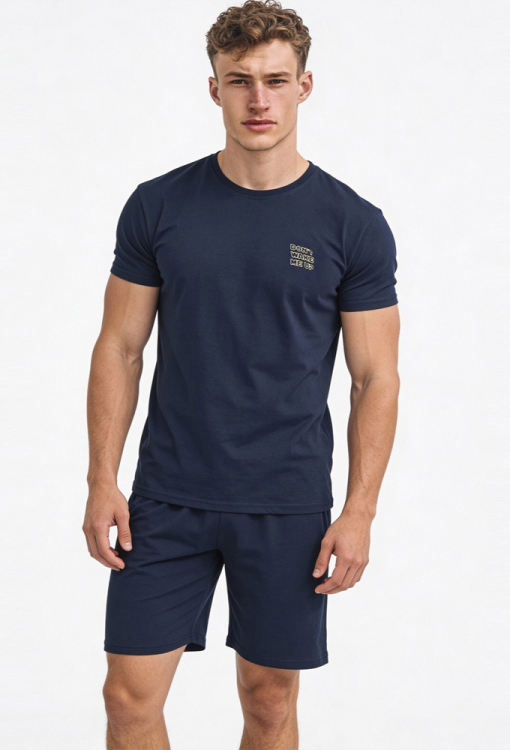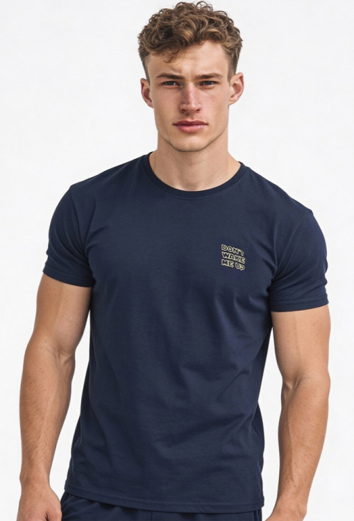 Молодежная мужская пижама Don`t Wake Me Up от польского бренда Cornette. Пижама выполнена из качественного и мягкого хлопка темно-синего цвета, состоит из футболки и шортов прямого силуэта. Футболка с короткими рукавами и круглым вырезом горла, на груди слева украшена небольшим принтом из надписи "Don`t Wake Me Up", спинка также стильно украшена надписями. Шорты с удобной посадкой и мягкой резинкой в поясе. Пижама красивая и очень комфортная, будет замечательной одеждой для сна и домашнего отдыха, а также хорошим подарком близкому человеку.