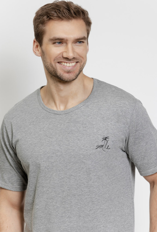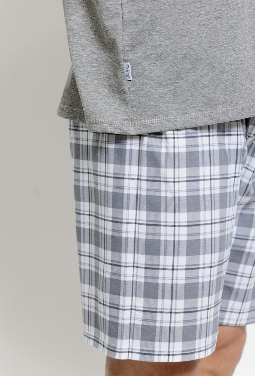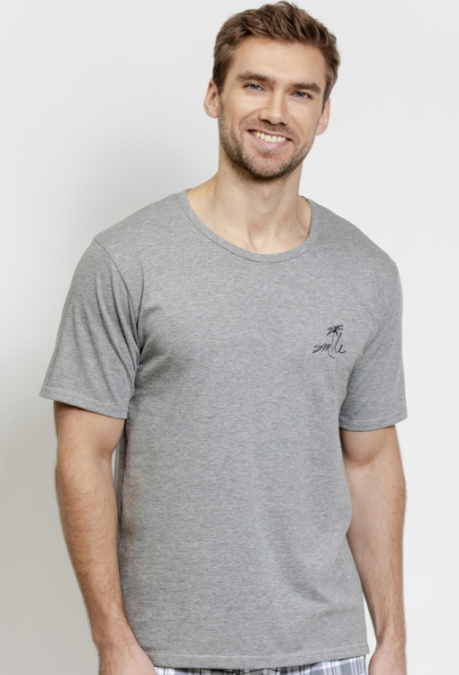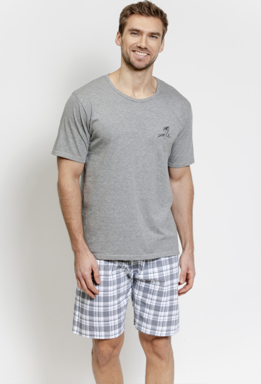 Комфортная мужская пижама Eliot от польского бренда Taro. Пижама выполнена из качественного и мягкого хлопка, состоит из футболки серого меланжевого цвета и белых шорт с серым клетчатым принтом. Футболка прямого силуэта, с короткими рукавами и круглым вырезом горла, вверху слева украшена принтом из пальмы, шорты прямого кроя с мягкой резинкой в поясе. Пижама очень красивая и приятная к телу, также будет удобной домашней одеждой или замечательным подарком для близких людей.