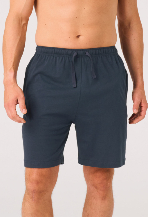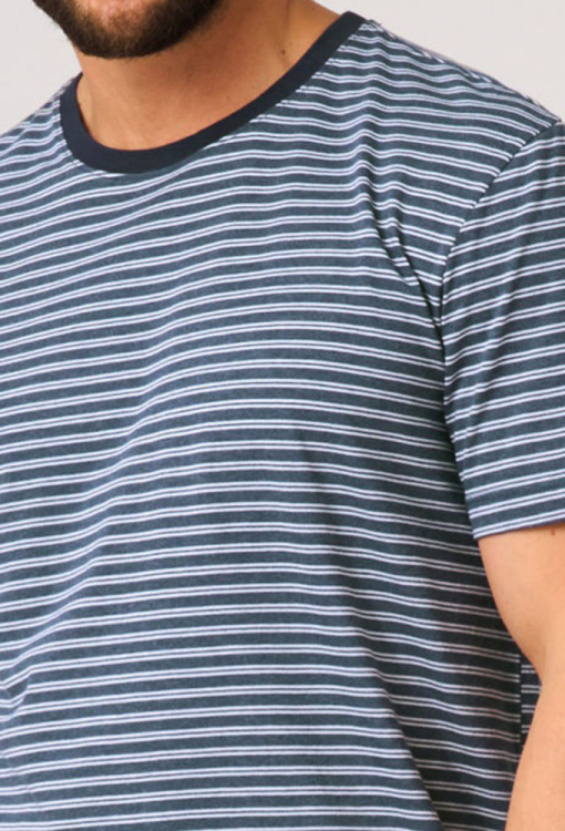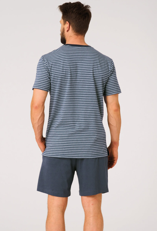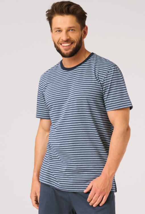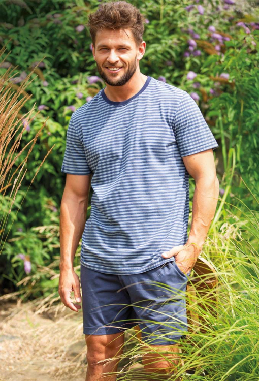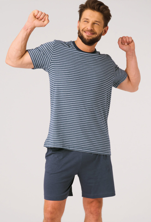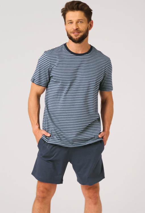 Классическая мужская пижама от польского бренда Key. Пижама выполнена из качественного и мягкого хлопка, состоит из футболки в полосатый принт темно-синего и белого цвета и однотонных темно-синих шортов. Футболка прямого кроя, с короткими рукавами и круглым вырезом горла. Горловина модели обработана трикотажным кантом темно-синего цвета, боковые разрезы внизу усилены хлопковой лентой. Шорты с мягкой резинкой в поясе и удобными боковыми карманами, регулируются по ширине с помощью внутреннего шнурка. Пижама красивая и очень комфортная, идеальна для дома и путешествий, также может быть замечательным подарком любимому или близкому человеку.