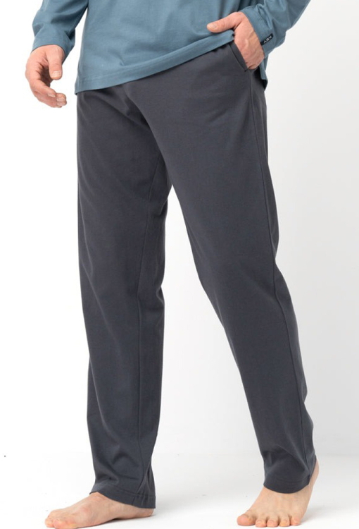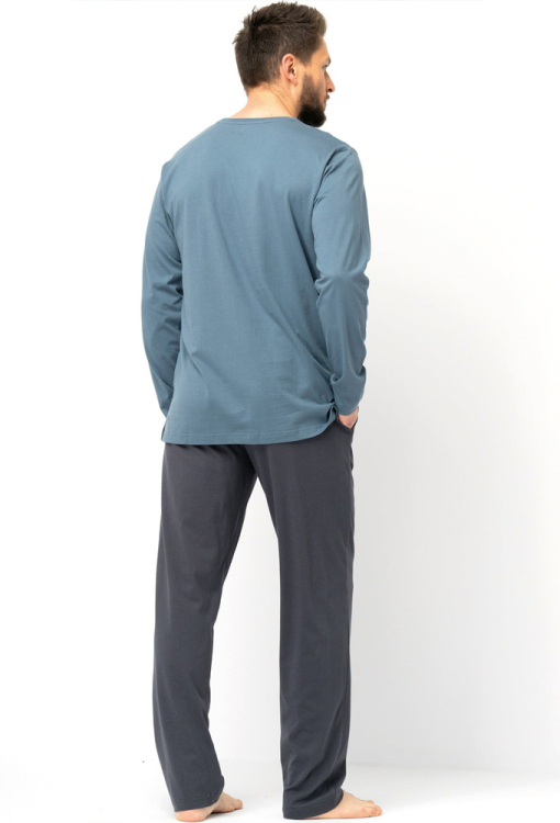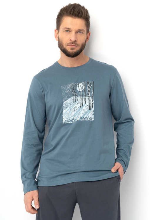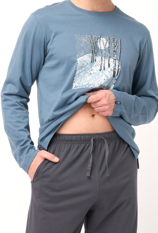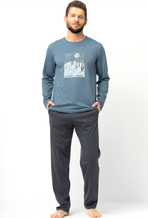 Современная пижама мужская от польского бренда Key. Пижама выполнена из качественного и мягкого хлопка, состоит из кофты синего цвета и темно-синих штанов. Кофта с длинными рукавами и круглым вырезом горла, спереди украшена принтом в виде пейзажа зимнего леса. Штаны с мягкой резинкой в поясе и удобными боковыми карманами, регулируются по ширине с помощью внутреннего шнурка. Пижама красивая и очень комфортная, идеальный выбор для любого сезона, а также может быть замечательным подарком любимому или близкому человеку.