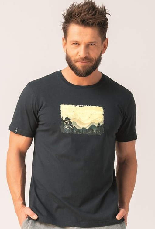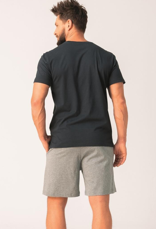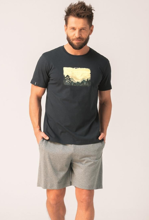 Стильная пижама мужская от польского бренда Key. Пижама выполнена из качественного и мягкого хлопка, состоит из футболки графитового цвета и серых меланжевых шорт. Футболка прямого кроя, с короткими рукавами и круглым вырезом горла, спереди украшена крупным принтом горного пейзажа, рукав обработан хлопчатобумажной лентой с надписью "Key". Шорты с мягкой резинкой в поясе и удобными боковыми карманами. Пижама красивая и очень комфортная, идеальна для дома и путешествий, а также может быть замечательным подарком любимому или близкому человеку.