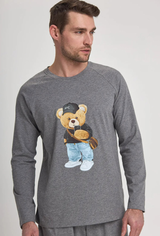 Стильная пижама мужская Launge Luxe от украинского бренда Ellen. Пижама выполнена из качественного и мягкого хлопка серого цвета, состоит из кофты и штанов. Кофта прямого силуэта, с длинными рукавами и круглым вырезом горла, спереди украшена ярким принтом в виде плюшевого медведя с телефоном. Штаны с мягкой резинкой в поясе и удобными боковыми карманами. Пижама очень красивая и комфортная, идеальна для сна и домашнего отдыха, а также может быть замечательным подарком любимому и близкому человеку.