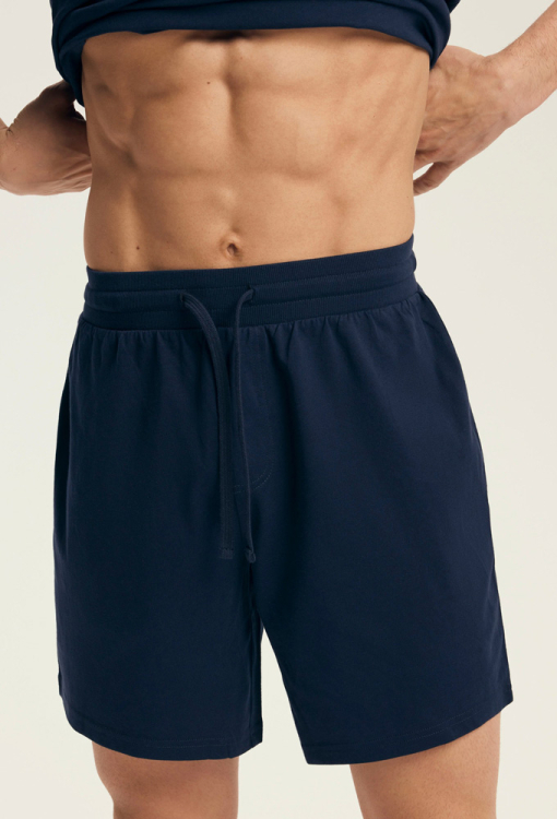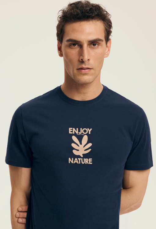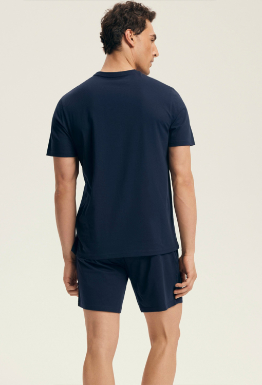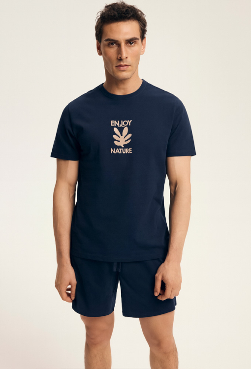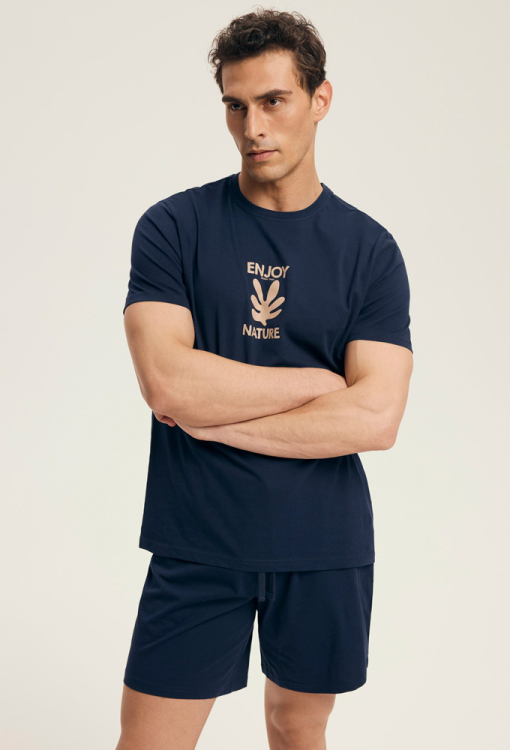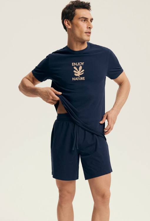 Легкая пижама мужская Legend от польского бренда Henderson. Пижама выполнена из качественного и мягкого хлопка темно-синего цвета, состоит из футболки прямого силуэта и коротких шорт. Футболка с короткими рукавами и круглым вырезом горла, спереди украшена стильным принтом листка и надписью "enjoy nature". Шорты с мягкой резинкой в поясе регулируются по ширине с помощью внутреннего шнурка, создают максимальный комфорт и свободу движений. Пижама красивая и невероятно удобная, идеальна для уютного сна и расслабленного домашнего отдыха, упакована в фирменную коробку, станет приятным подарком для любимого и близкого человека.