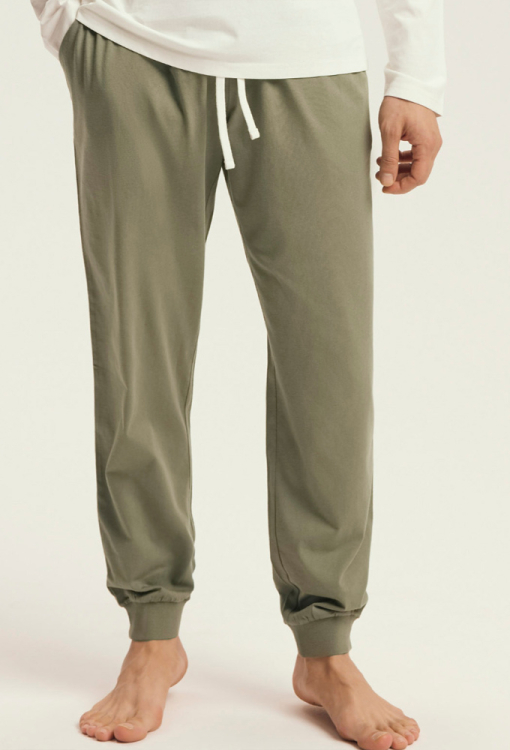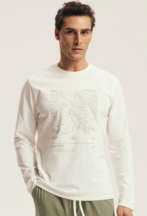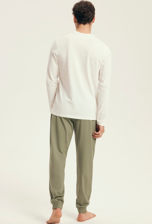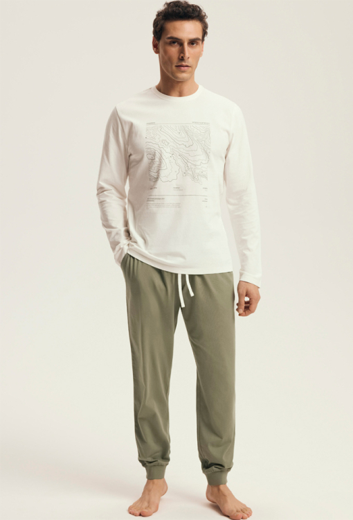Комфортная пижама мужская Local от польского бренда Henderson. Пижама выполнена из качественного и мягкого хлопка, состоит из кофты кремового цвета, прямого силуэта и зеленых штанов на манжетах. Кофта с длинными рукавами и круглым вырезом горла, спереди украшена принтом топографической карты. Штаны с мягкой резинкой на поясе и удобными боковыми карманами, регулируются по ширине с помощью внутреннего шнурка. Пижама очень красивая и приятная к телу, идеальна для сна и домашнего отдыха, упакованная в фирменную коробку, подойдет на подарок любимому и близкому человеку.