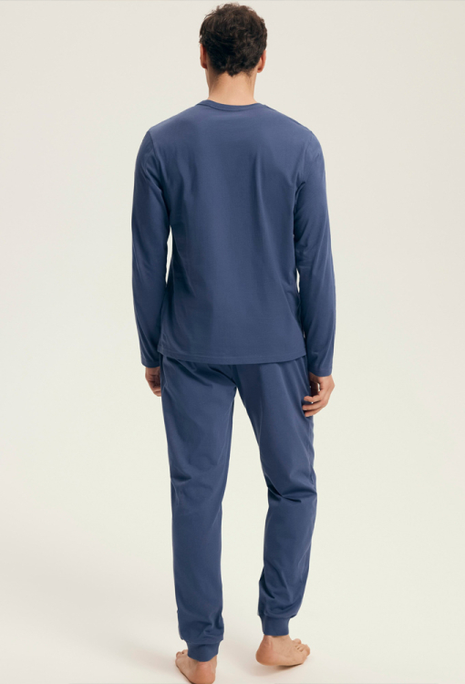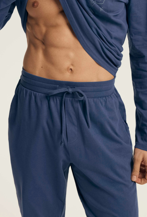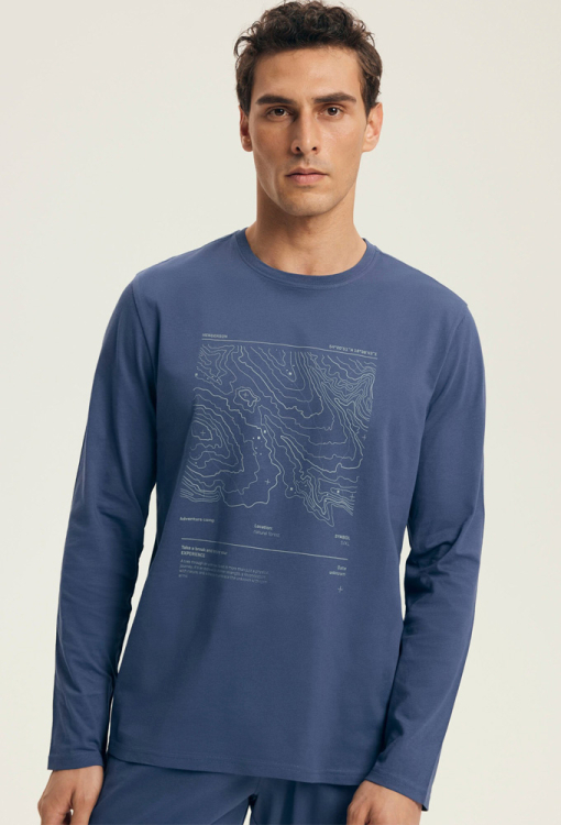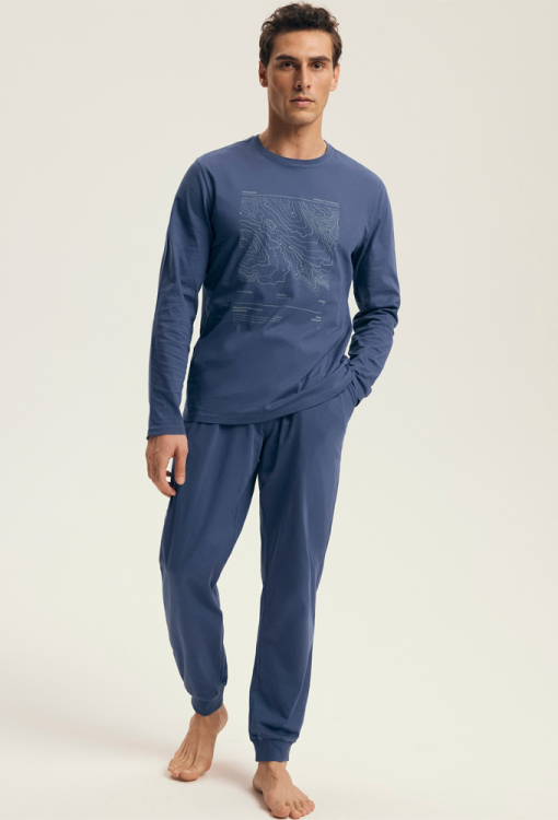 Комфортная пижама мужская Local от польского бренда Henderson. Пижама выполнена из качественного и мягкого хлопка джинсового цвета, состоит из кофты прямого силуэта и штанов на манжетах. Кофта с длинными рукавами и круглым вырезом горла, спереди украшена принтом топографической карты. Штаны с мягкой резинкой на поясе и удобными боковыми карманами, регулируются по ширине с помощью внутреннего шнурка. Пижама очень красивая и приятная к телу, идеальна для сна и домашнего отдыха, упакованная в фирменную коробку, подойдет на подарок любимому и близкому человеку.