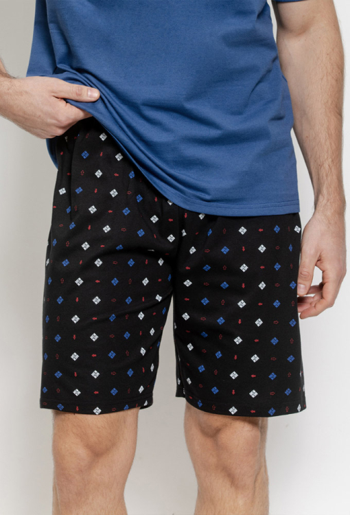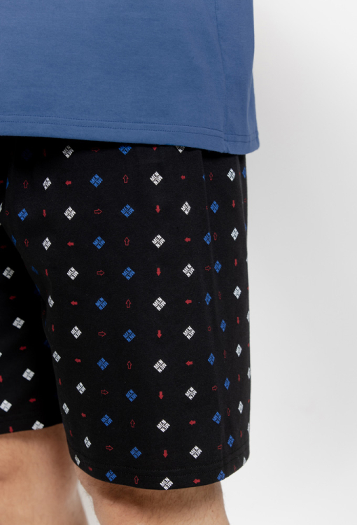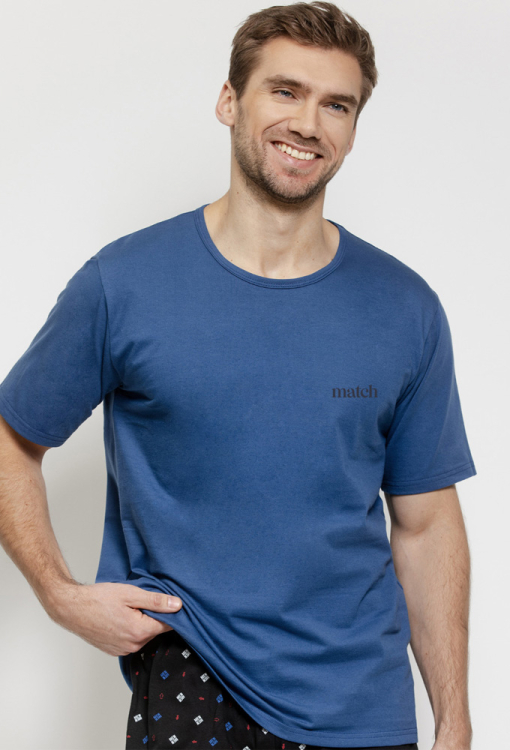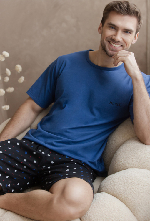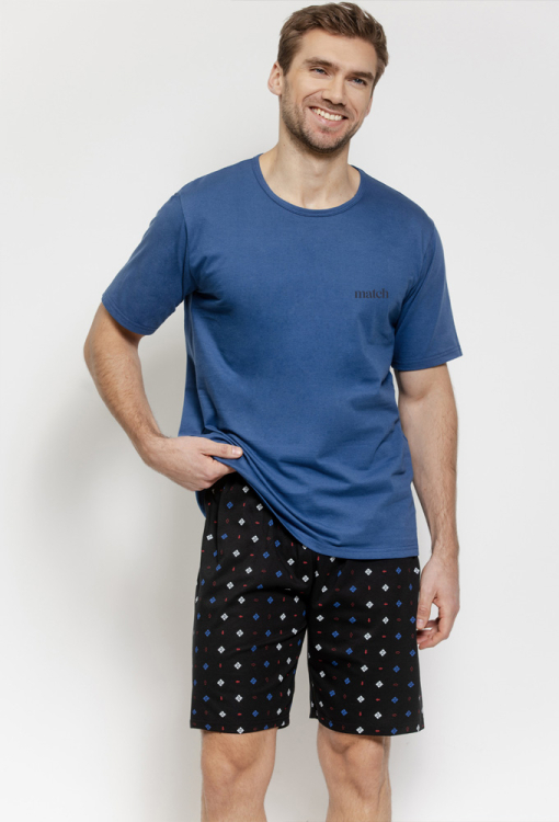 Стильная мужская пижама Matteo от польского бренда Taro. Пижама выполнена из качественного и мягкого хлопка, состоит из футболки джинсового цвета и черных шорт с графическим принтом синего, красного и белого цвета. Футболка прямого силуэта, с короткими рукавами и круглым вырезом горла, вверху слева украшена надписью "match". Шорты прямого кроя с комфортной посадкой и мягкой резинкой в поясе. Пижама очень красивая и приятная к телу, также будет удобной домашней одеждой или замечательным подарком для близких людей.