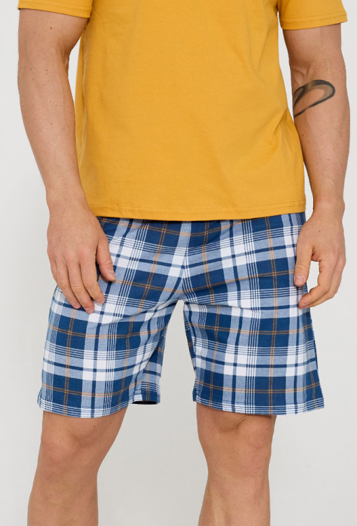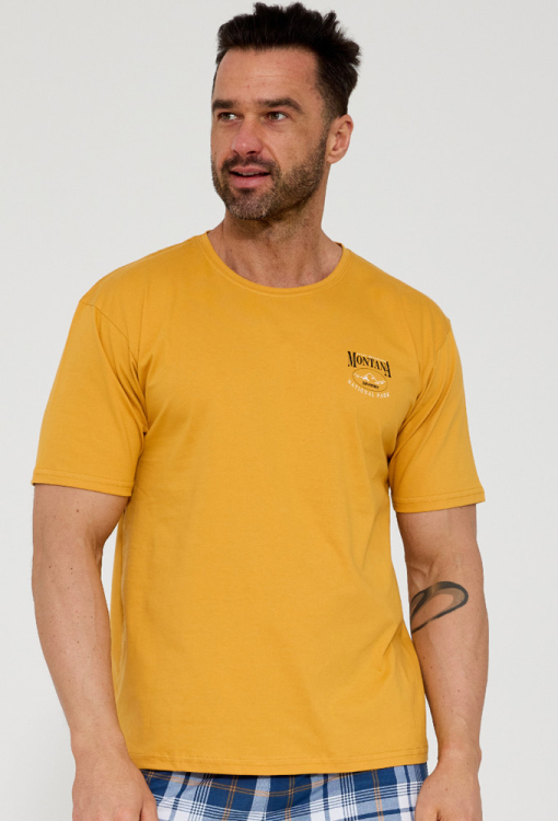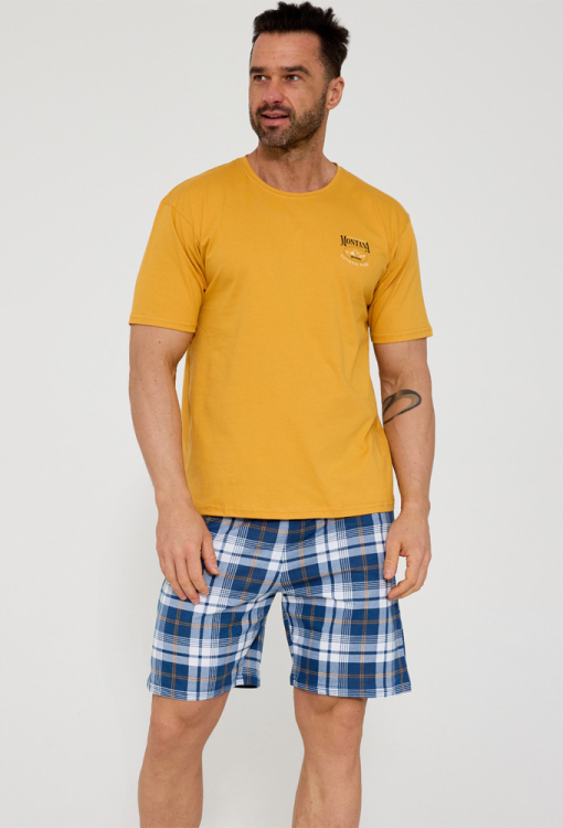 Комфортная мужская пижама Montana от польского бренда Cornette. Пижама выполнена из качественного и мягкого хлопка, состоит из футболки желтого цвета и синих шорт в белый клетчатый принт с желтым акцентом. Футболка с короткими рукавами и круглым вырезом горла, на груди слева украшена небольшим принтом из надписи "Montana", шорты с мягкой резинкой в поясе. Пижама очень красивая и удобная, идеальна для сна и домашнего отдыха летом, упакованная в коробку, станет замечательным подарком близким людям.