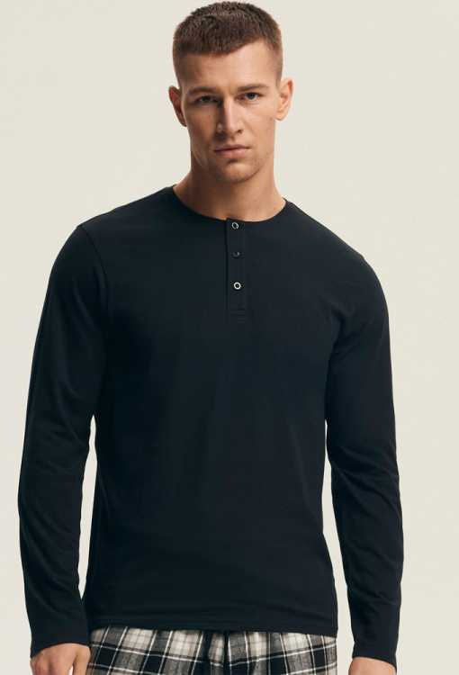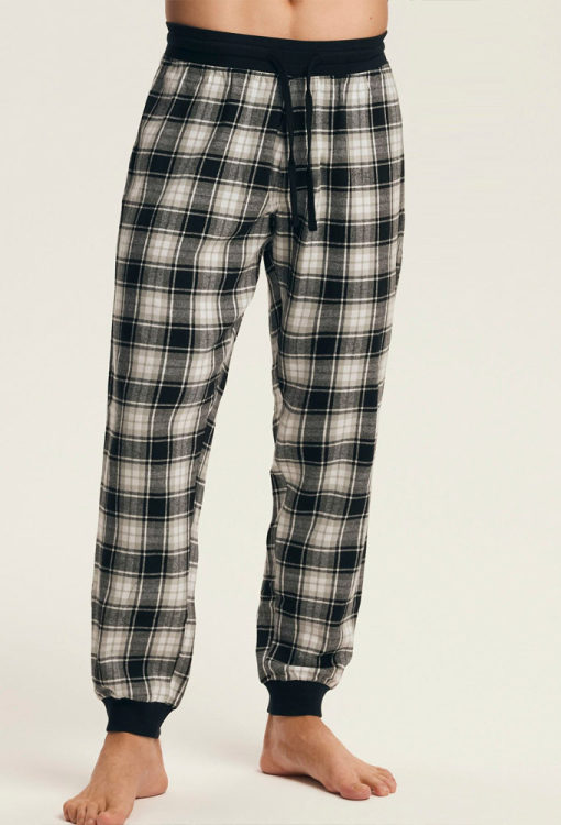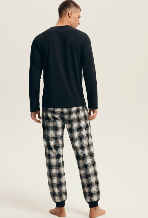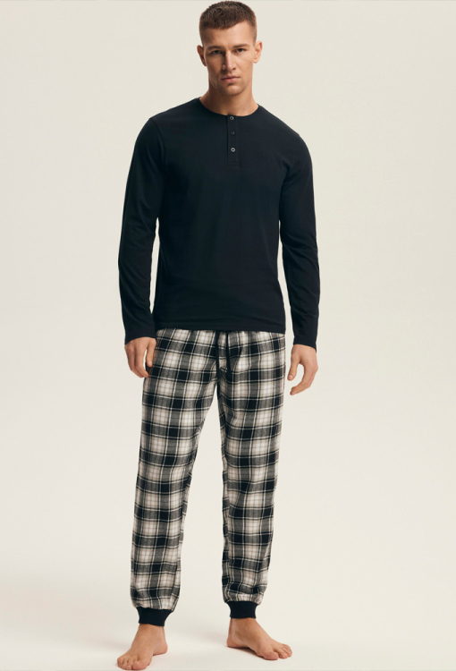 Практичная пижама мужская Noir от польского бренда Henderson. Пижама выполнена из качественного и мягкого хлопка, состоит из кофты черного цвета, прямого силуэта и штанов в черный с бежевым клетчатый принт. Кофта с длинными рукавами и круглым вырезом горла, дополнена планкой застежкой с тремя пуговицами. Штаны обработаны широким черным поясом с мягкой резинкой и внутренним шнурком, низ выполнен на черных манжетах. Пижама выглядит стильно и обеспечивает максимальный комфорт во время сна и отдыха, благодаря фирменной подарочной коробке она станет отличным подарком для любимого или близкого человека.