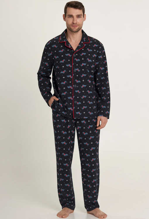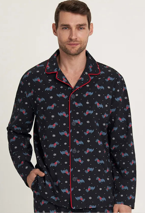 Классическая пижама мужская из коллекции Snowy Weanther от украинского бренда Ellen. Пижама выполнена из качественного и мягкого хлопка черного цвета в принт из собачек в красных шарфах и белых снежинок, состоит из рубашки со штанами прямого силуэта. Рубашка с длинными рукавами и отложным воротником, застегивается на пуговицы. Воротник и полки модели украшены тонким кантом красного цвета. Штаны с мягкой резинкой в поясе и удобными боковыми карманами. Пижама очень красивая и комфортная, также может быть отличной одеждой для дома или полезным подарком любимому и близкому человеку.