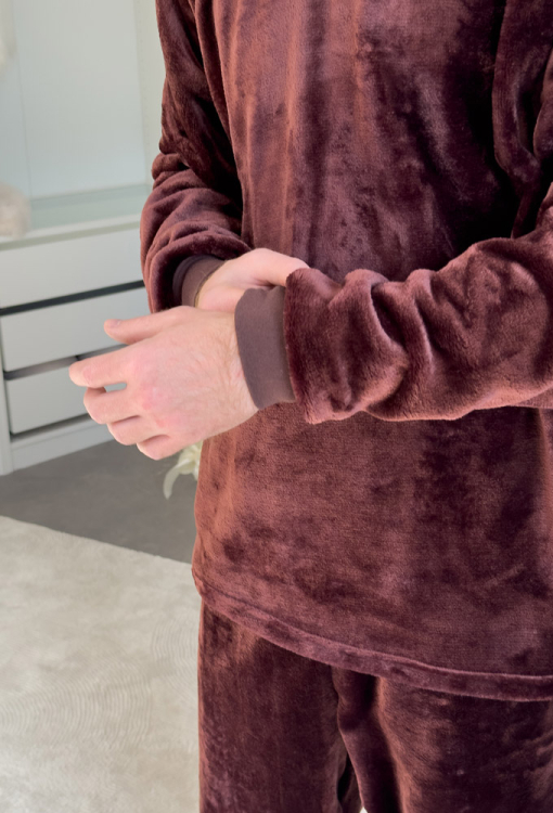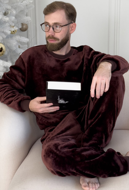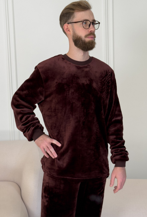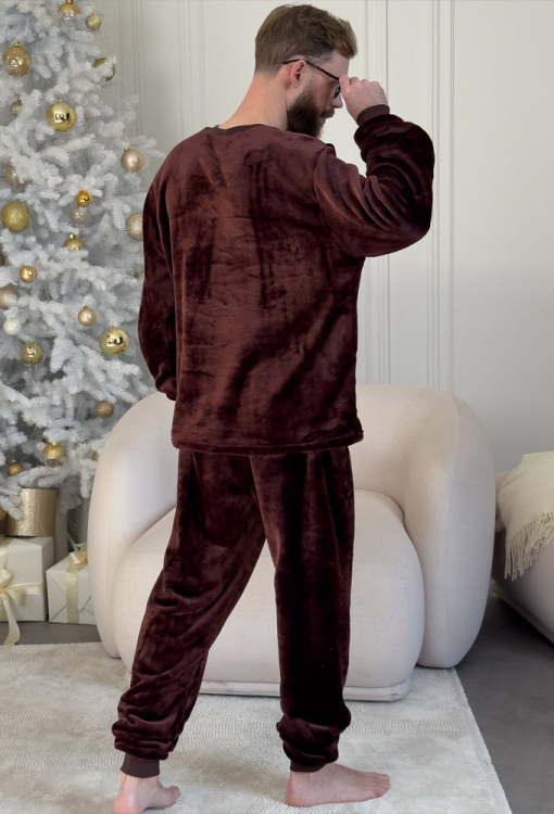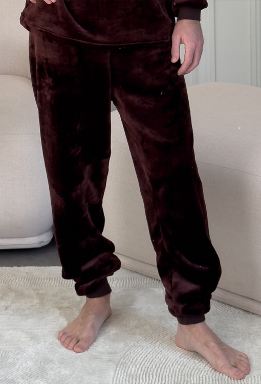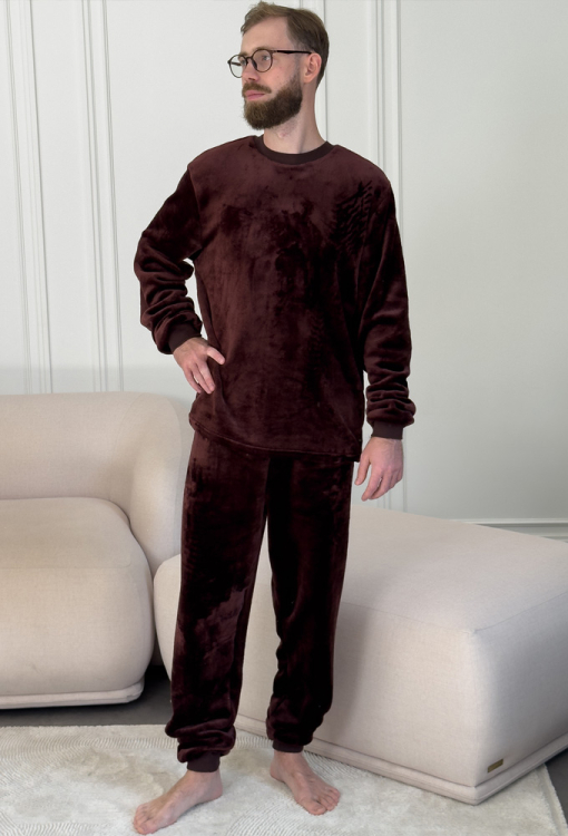 Зимняя пижама мужская Теплик от украинского бренда Cosy. Пижама выполнена из качественного и мягкого велсофта шоколадного цвета, состоит из кофты свободного кроя и штанов на манжетах. Кофта с длинными рукавами и круглым вырезом горла, горловина и рукава обработаны трикотажными манжетами, штаны с мягкой резинкой в поясе. Пижама красивая и очень комфортная, можно использовать для отдыха дома за чтением книги или в качестве подарка любимому и близкому человеку.