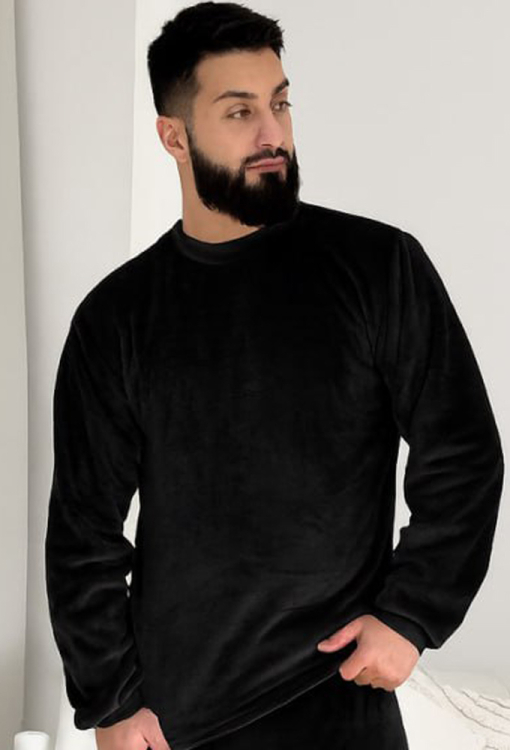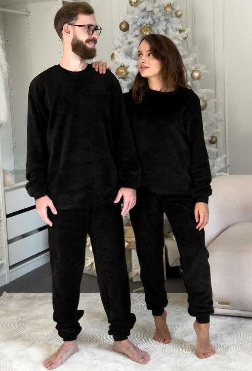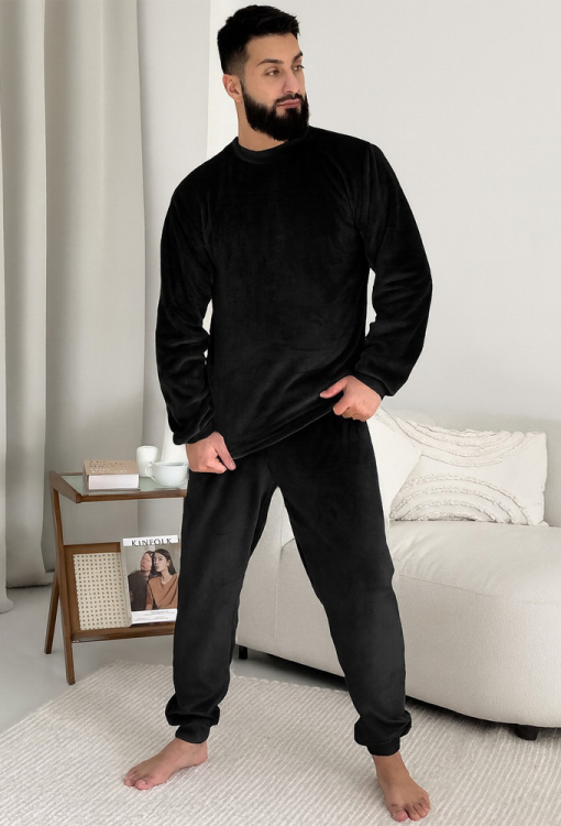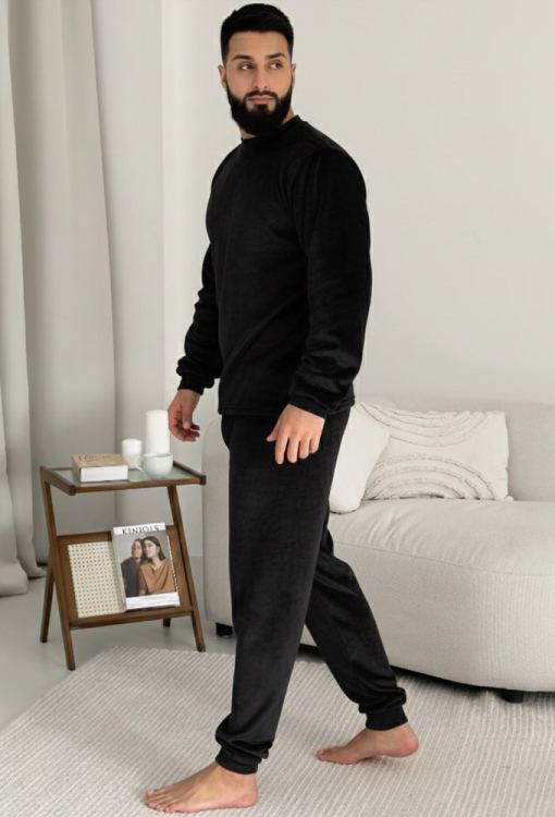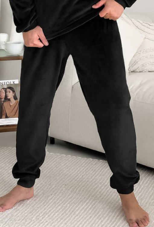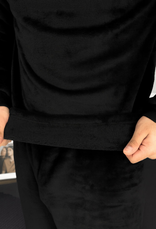 Зимняя пижама мужская Теплик от украинского бренда Cosy. Пижама выполнена из качественного и мягкого велсофта черного цвета, состоит из кофты свободного кроя и штанов на манжетах. Кофта с длинными рукавами и круглым вырезом горла, горловина и рукава обработаны трикотажными манжетами, штаны с мягкой резинкой в поясе. Пижама красивая и очень комфортная, можно использовать для отдыха дома за чтением книги или в качестве подарка любимому и близкому человеку.